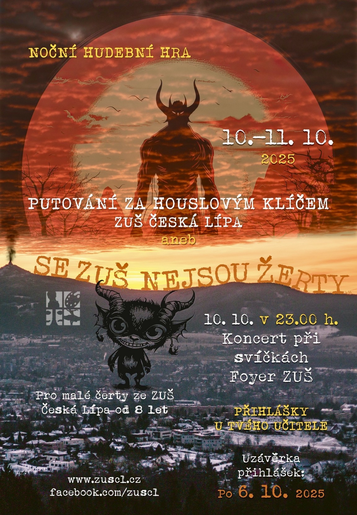 Pozor, malí i velcí čerti! Letošní noční hudební hra Putování za houslovým klíčem aneb „SE ZUŠ NEJSOU ŽERTY“ začne v pátek 10. října v 18 hodin. Přihlášky si můžete vyzvednout u svého učitele, případně vytisknout zde a vyplněné odevzdat do 6. října svému učiteli nebo v kanceláři školy. Těšíme se na všechny odvážlivce od 8 let, kteří si chtějí užít noc plnou hudby, super úkolů a dobrodružství! Více info