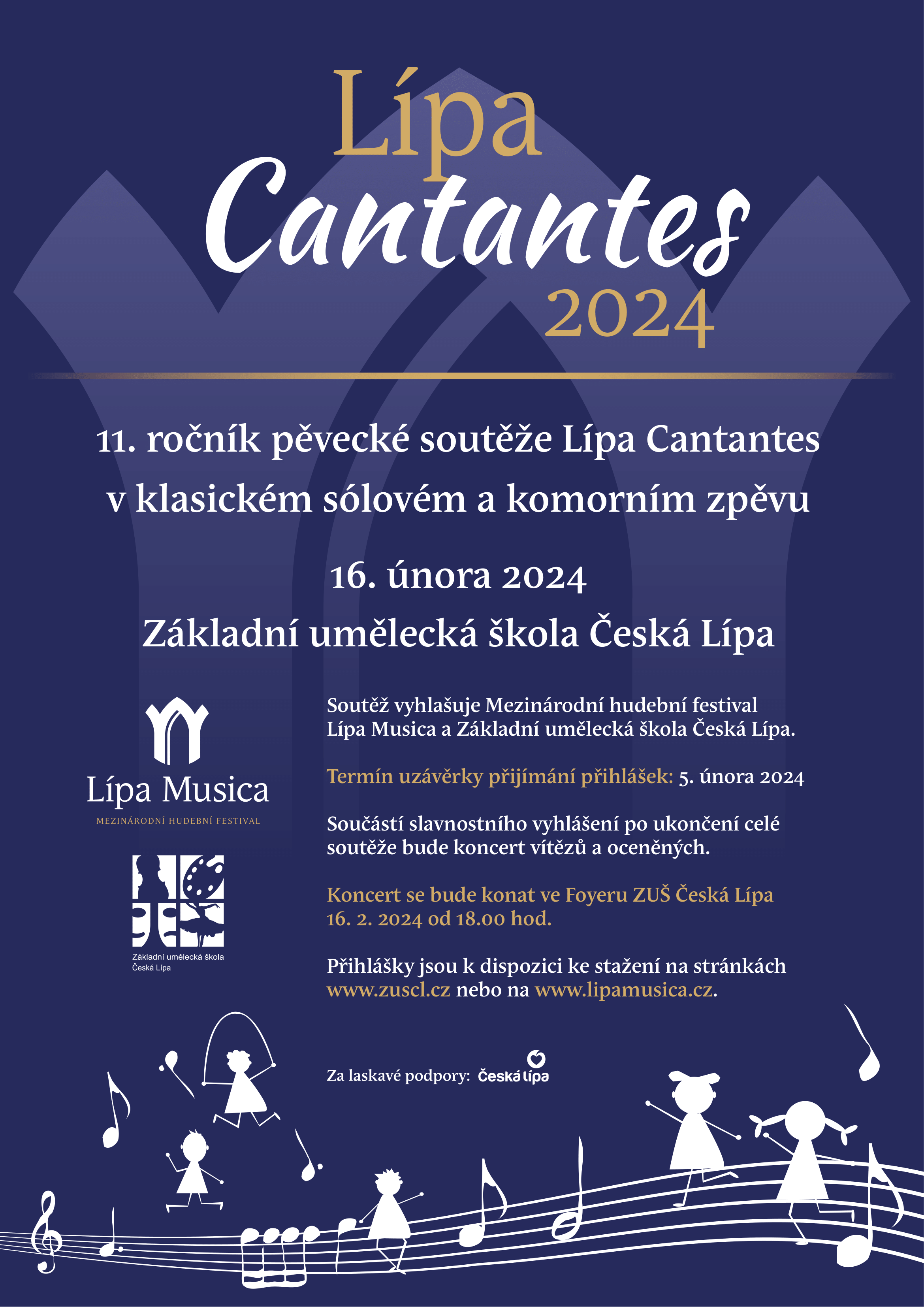 Základní umělecká škola Česká Lípa a Mezinárodní hudební festival Lípa Musica vyhlašují již 11. ročník pěvecké soutěže v klasickém sólovém a komorním zpěvu LÍPA CANTANTES 2024 pro žáky ZUŠ Libereckého a Ústeckého kraje ve věku od 7 do 25 let, který proběhne 16. února 2024. Smyslem soutěže je podpořit zájem dětí a mladých lidí o klasický zpěv a vytvořit příležitost pro talentované žáky k porovnání jejich dovedností a získání prvních koncertních zkušeností.