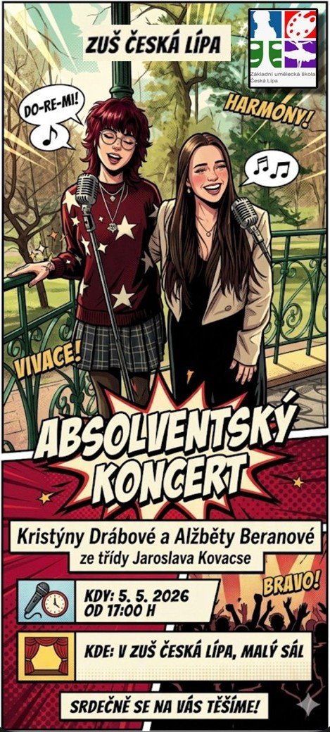 Kristýna Drábová a Alžběta Beranová z pěvecké třídy Jaroslava Kovacse vás srdečně zvou na svůj absolventský koncert, který se uskuteční v úterý 5. května od 17:00 v Malém sále ZUŠ. Večer nabídne pestrý program složený z oblíbených skladeb od Boba Dylana a Davida Stypky až po rockové Radiohead, to vše za doprovodu kapely a hostů. Přijďte podpořit obě zpěvačky při jejich finálním vystoupení.
