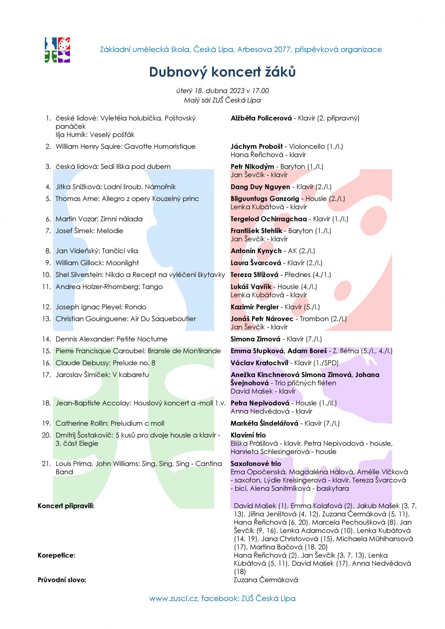 Další společný koncert žáků z celé školy uvedeme 18. dubna 2023 v 17 hodin na Malém sále. Srdečně zveme příbuzné, přátele a fanoušky našich nadaných žáků a studentů.