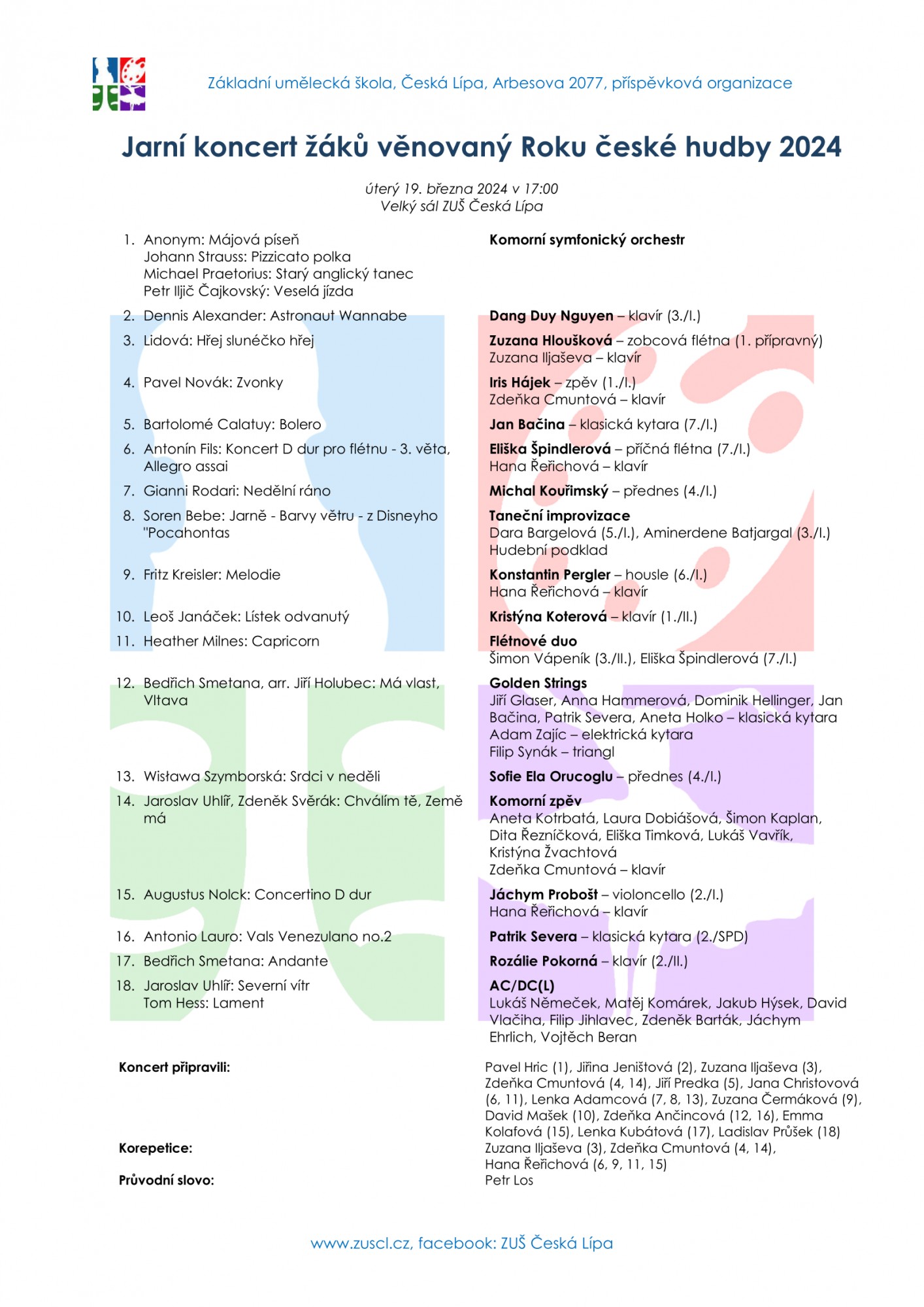 Pojďte se ZUŠ Česká Lípa přivítat jaro na Jarním koncertu žáků v úterý 19. března ve Velkém sále ZUŠ, kde je od 17 hodin připravena pestrá, nejen hudební nadílka. Tímto koncertem se přidáváme k oslavám Roku české hudby 2024, který se nese v duchu hlavního sdělení: "Hudba jsme my".