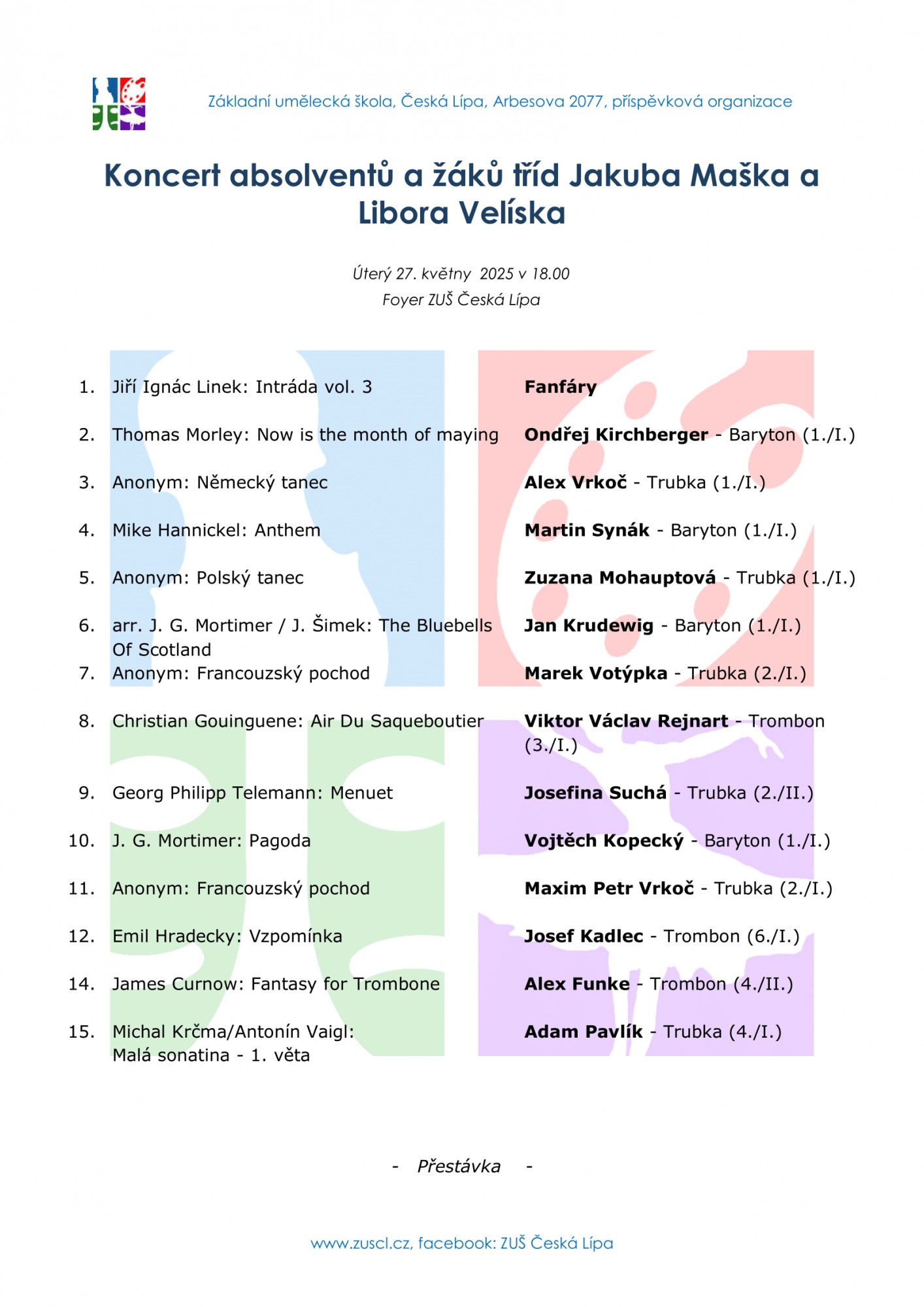 V úterý 27. května se netradičně od 18 hodin uskuteční ve Foyer ZUŠ Koncert absolventů a žáků žesťových tříd Jakuba Maška a Libora Velíska. Společně vám předvedou pestrý hudební program, který vás zaručeně zaujme.