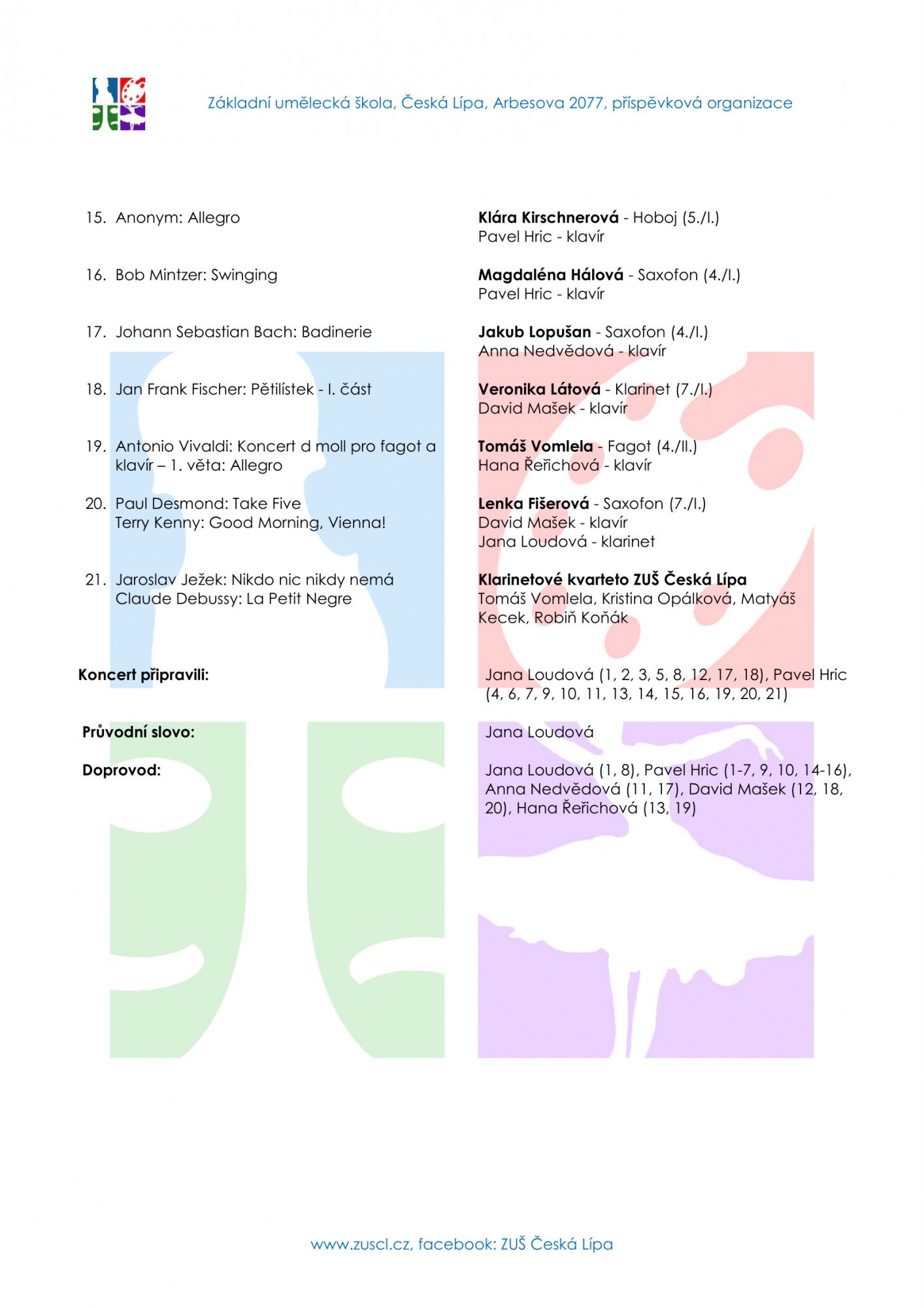Naposledy tento školní rok ožije Foyer ZUŠ hudbou na společném koncertu klarinetových a saxofonových tříd Jany Loudové a Pavla Hrice těsně před prázdninami ve čtvrtek 29. června od 17 hodin.
