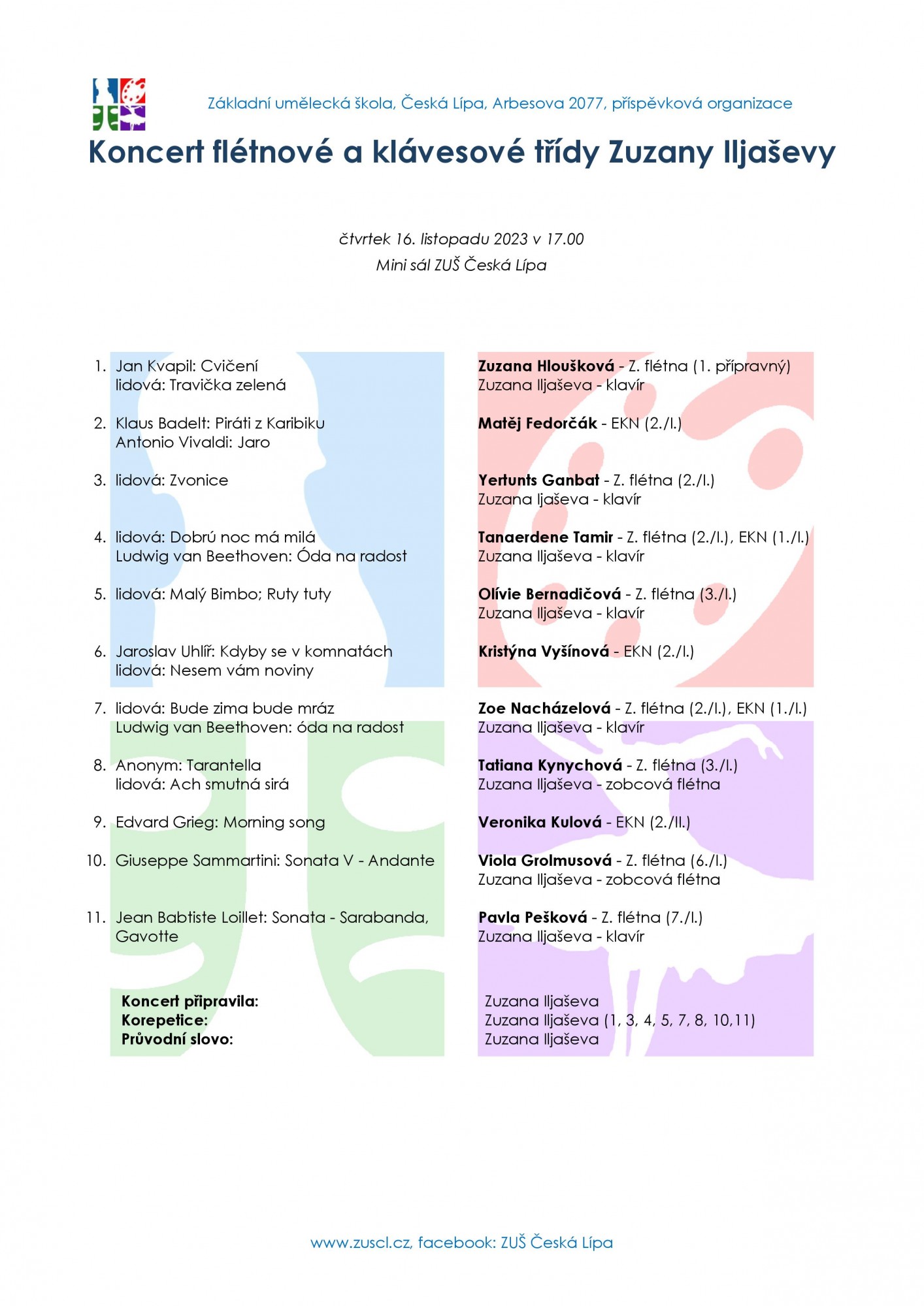 Koncert žáků a studentů hry na flétny a klávesové nástroje ze třídy p. uč. Zuzany Iljaševy můžete navštívit ve čtvrtek 16. listopadu v Minisále ZUŠ od 17 hodin. Přejeme příjemný hudební zážitek.