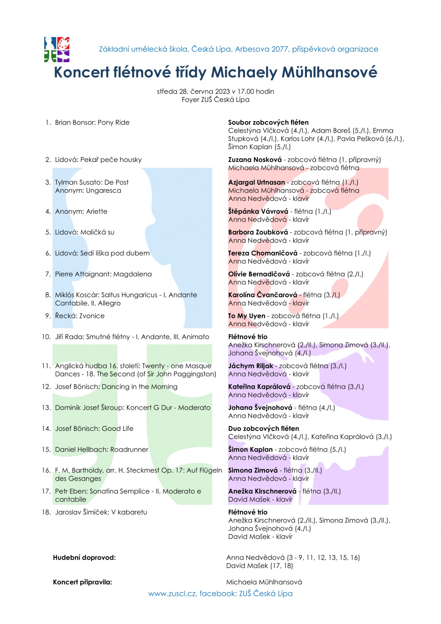 Zobcové a příčné flétny rozezní žáci a studenti p. uč. Michaely Mühlhansové na svém třídním koncertu ve středu 28. června ve Foyer ZUŠ od 17 hodin.