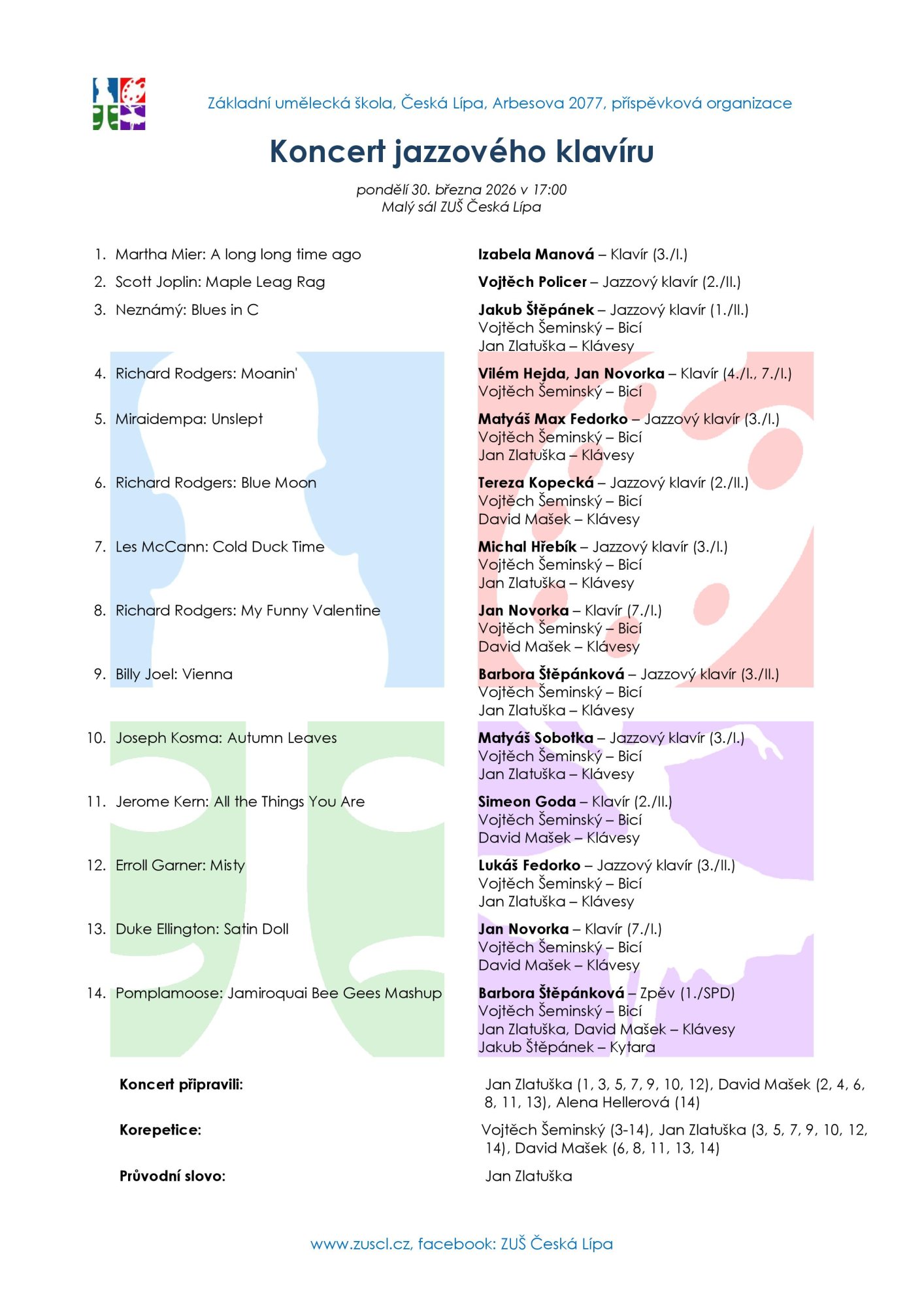 Zveme vás na koncert jazzového klavíru, který se uskuteční v pondělí 30. března od 17 hodin v Malém sále ZUŠ. Uslyšíte pestrý program plný swingových i moderních jazzových skladeb v podání talentovaných interpretů. Přijďte si užít příjemnou atmosféru a jedinečný hudební zážitek.