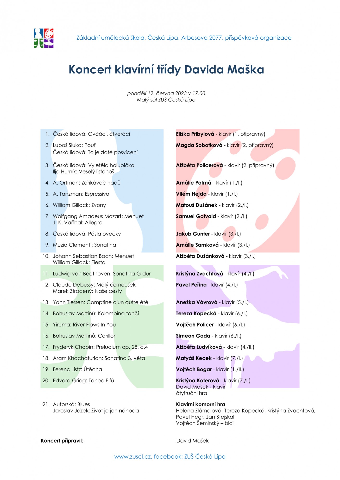 Přijďte na koncert plný okouzlujících klavírních tónů v pondělí 12. června do Malého sálu ZUŠ, kde vám od 17 hodin zahrají žáci z klavírní třídy Davida Maška.