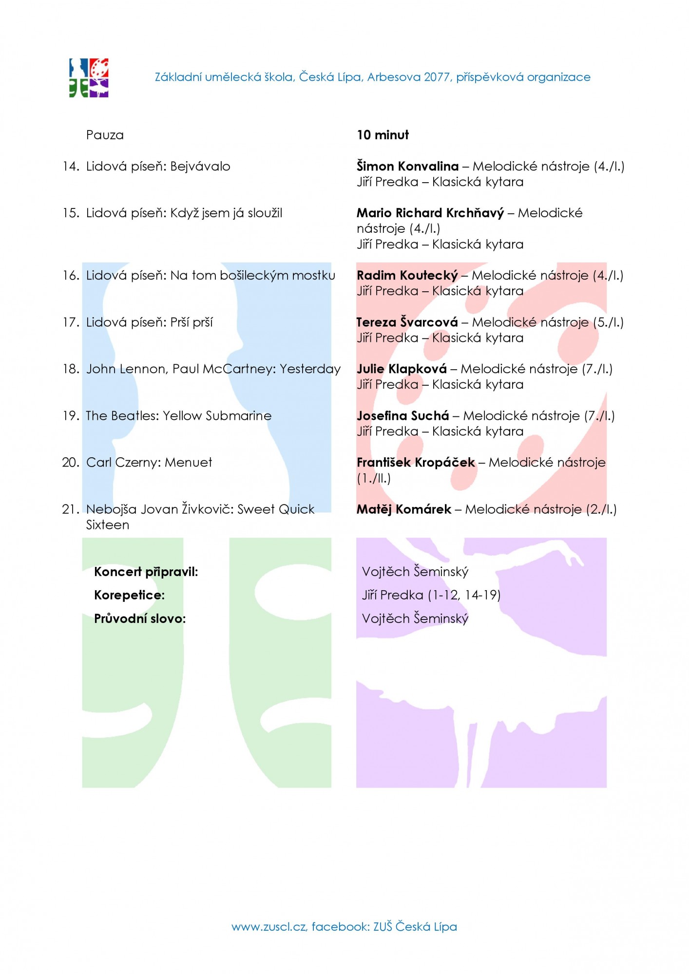Na melodické nástroje v rukou bicistů ze třídy Vojtěcha Šeminského se můžou příbuzní a fanoušci těšit v pondělí 17. června ve Velkém sále ZUŠ od 17 hodin. Program