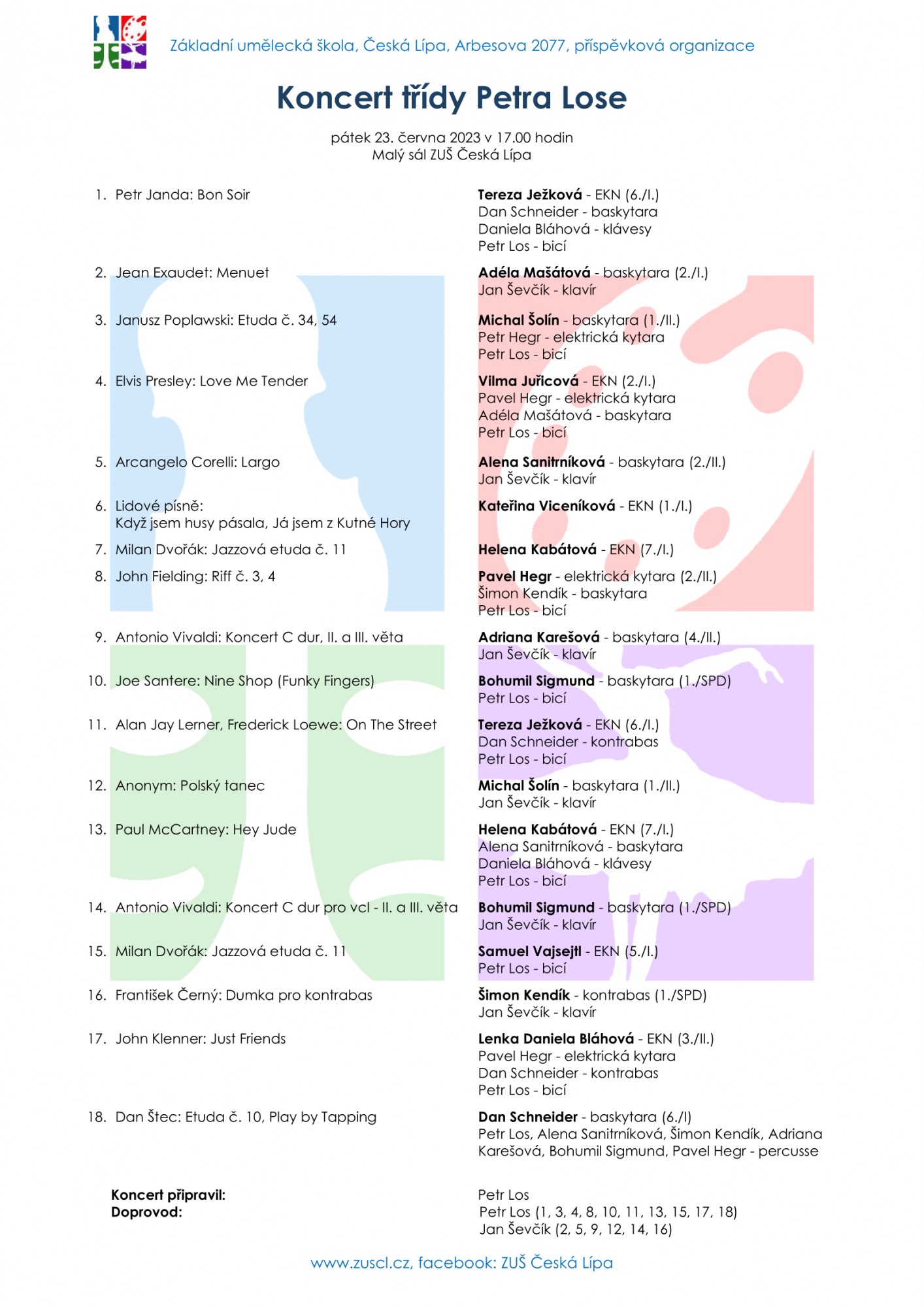 Hra na elektrické klávesy, el. kytaru, baskytaru i kontrabas zazní na koncertu třídy p. uč. Petra Lose v pátek 23. června v Malém sále ZUŠ od 17 hodin.