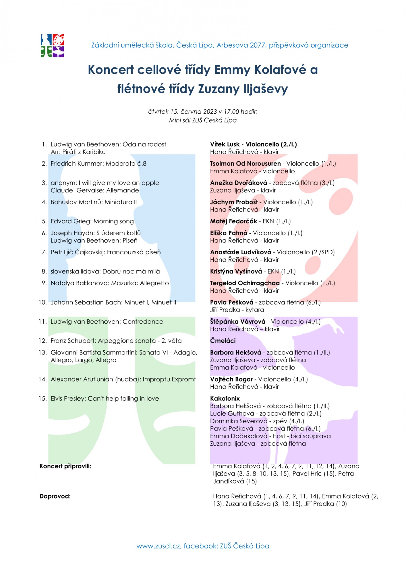 Violoncello je nástroj plný bohatých tónů a hloubky. Jak dokáže oslovit posluchače na emocionální úrovni ve spojení s klavírem a flétnou se můžete přesvědčit ve čtvrtek 15. června na Minisále ZUŠ od 17 hodin na společném koncertu tříd Emmy Kolafové a Zuzany Iljaševy. A nebude chybět ani Kakofonix a Čmeláci.