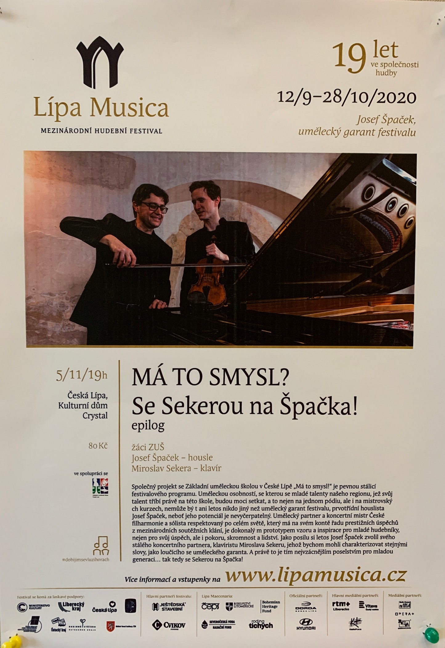 Společný projekt se spolkem ARBOR v České Lípě „Má to smysl!“ je pevnou stálicí programu MHF Lípa Musica. Uměleckou osobností, se kterou se mladé talenty naší školy budou moci setkat, a to nejen na jednom pódiu, ale i na mistrovských kurzech, není letos nikdo jiný než umělecký garant festivalu, prvotřídní houslista Josef Špaček, neboť jeho potenciál je nevyčerpatelný. Umělecký partner a koncertní mistr České filharmonie a sólista respektovaný po celém světě, který má na svém kontě řadu prestižních úspěchů z mezinárodních soutěžních klání, je dokonalý m prototypem vzoru a inspirace pro mladé hudebníky, nejen pro svůj úspěch, ale i pokoru, skromnost a lidství. Jako posilu si letos Josef Špaček zvolil svého stálého koncertního partnera, klavíristu Miroslava Sekeru, jehož bychom mohli charakterizovat stejnými slovy, jako loučícího se uměleckého garanta. A právě to je tím nejvzácnějším poselstvím pro mladou generaci… tak tedy se Sekerou na Špačka!