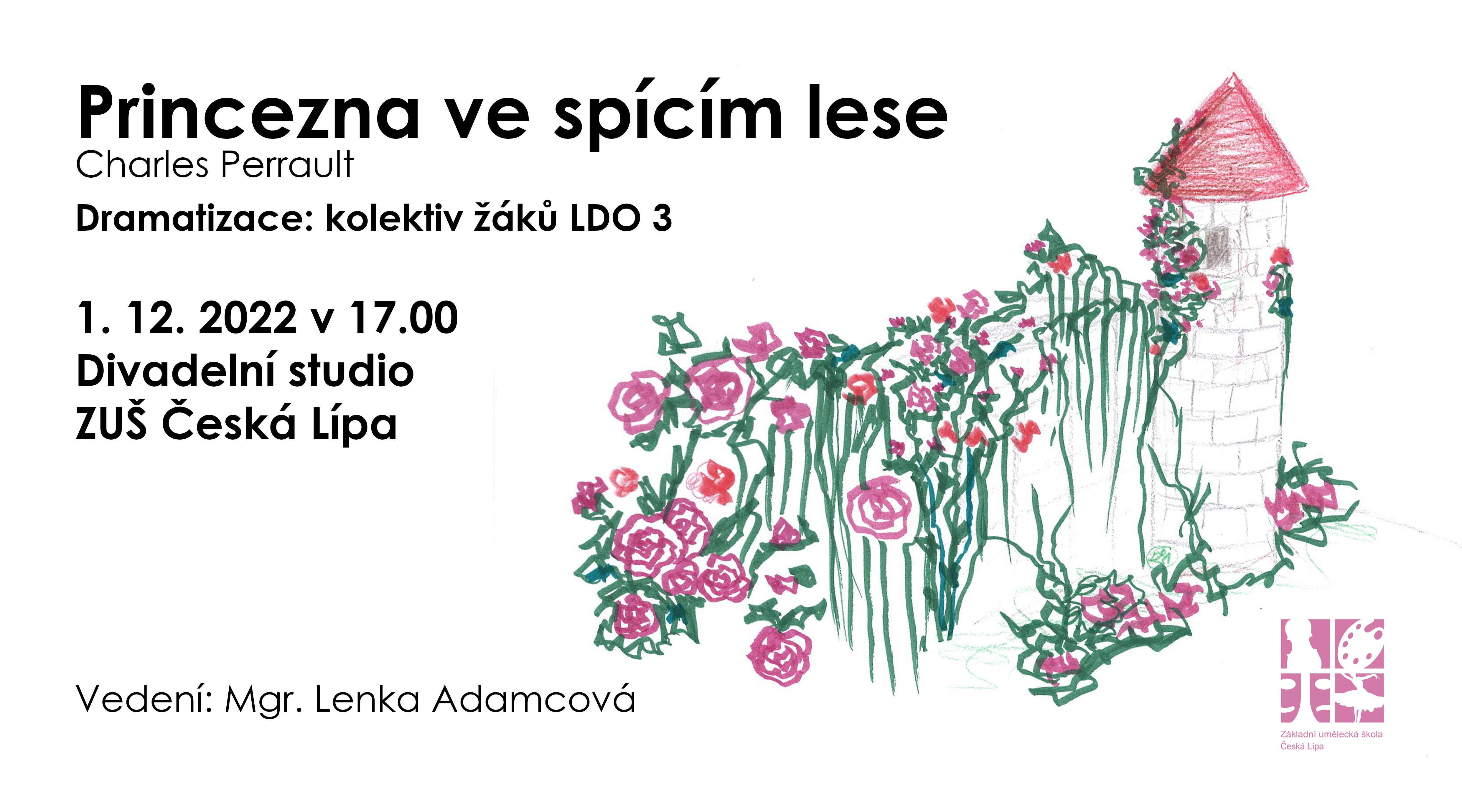 Žáci literárně-dramatického oboru pod vedením Lenky Adamcové si připravili nejen představení pro školy, ale i pro veřejnost, a to ve čtvrtek 1. prosince v Divadelním studiu ZUŠ od 17 hodin. Můžete se těšit na příběh od Carlese Perraulta Princezna ve spícím lese. Vstupenky zdarma budou k dispozici ve vrátnici ZUŠ.