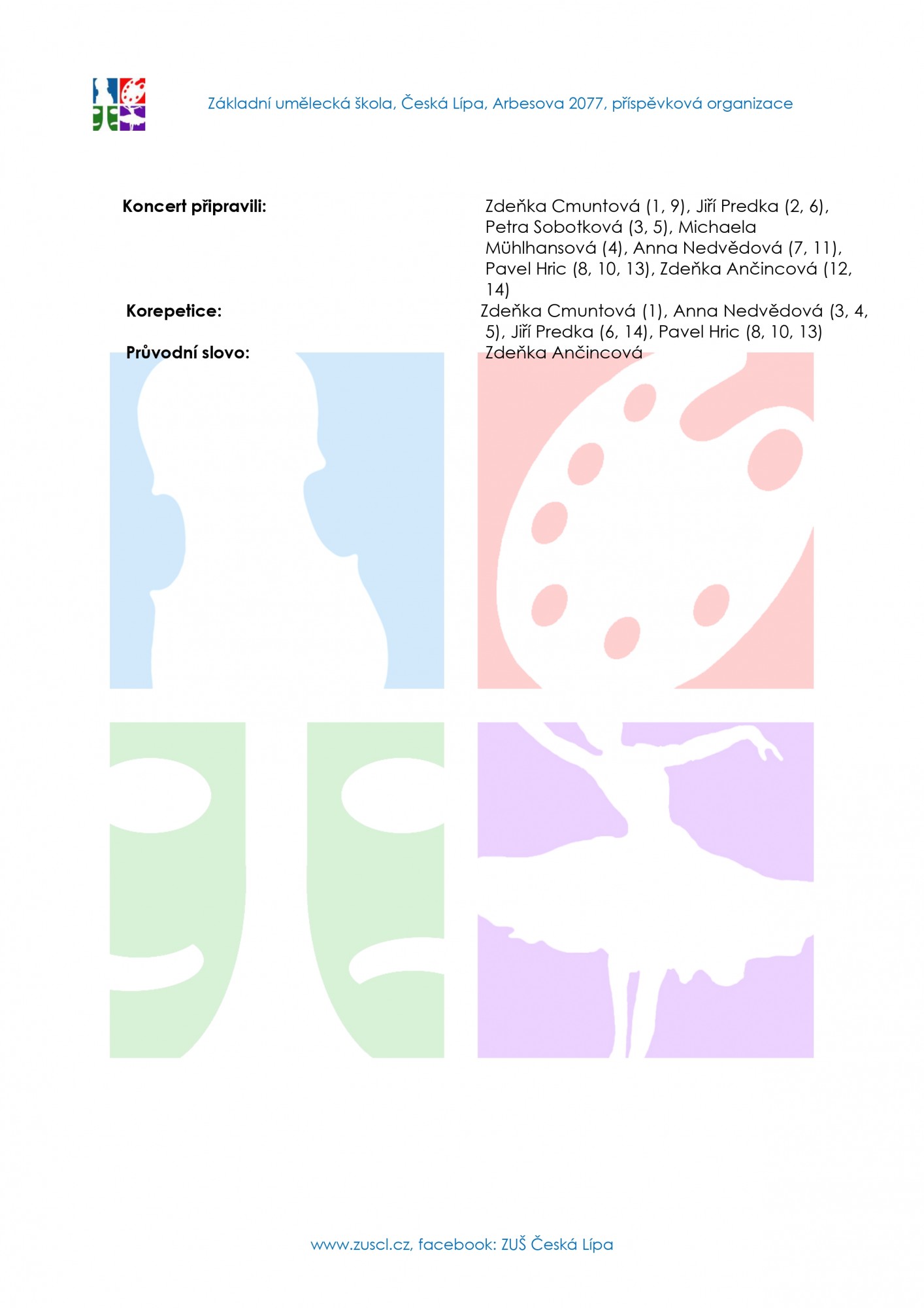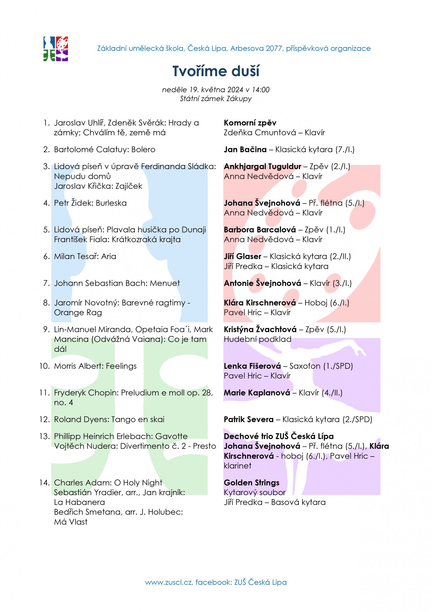 Ve dnech 18 a 19. května se uskuteční na zámku Zákupy 19. prezentační setkání umělců českolipského regionu v rámci XX. ročníku akce "Tvoříme duší". Mezi pozvanými účinkujícími nechybí každoročně ZUŠ Česká Lípa. V sobotu akci zahájí žáci žesťových tříd Jakuba Maška a Libora Velíska slavnostní fanfárou ve 13 hodin a v neděli vystoupí naši žáci v rámci koncertu od 14 hodin. Organizátory akce jsou Artefaktum-cz a Centrum pro zdravotně postižené libereckého kraje, o.p.s.