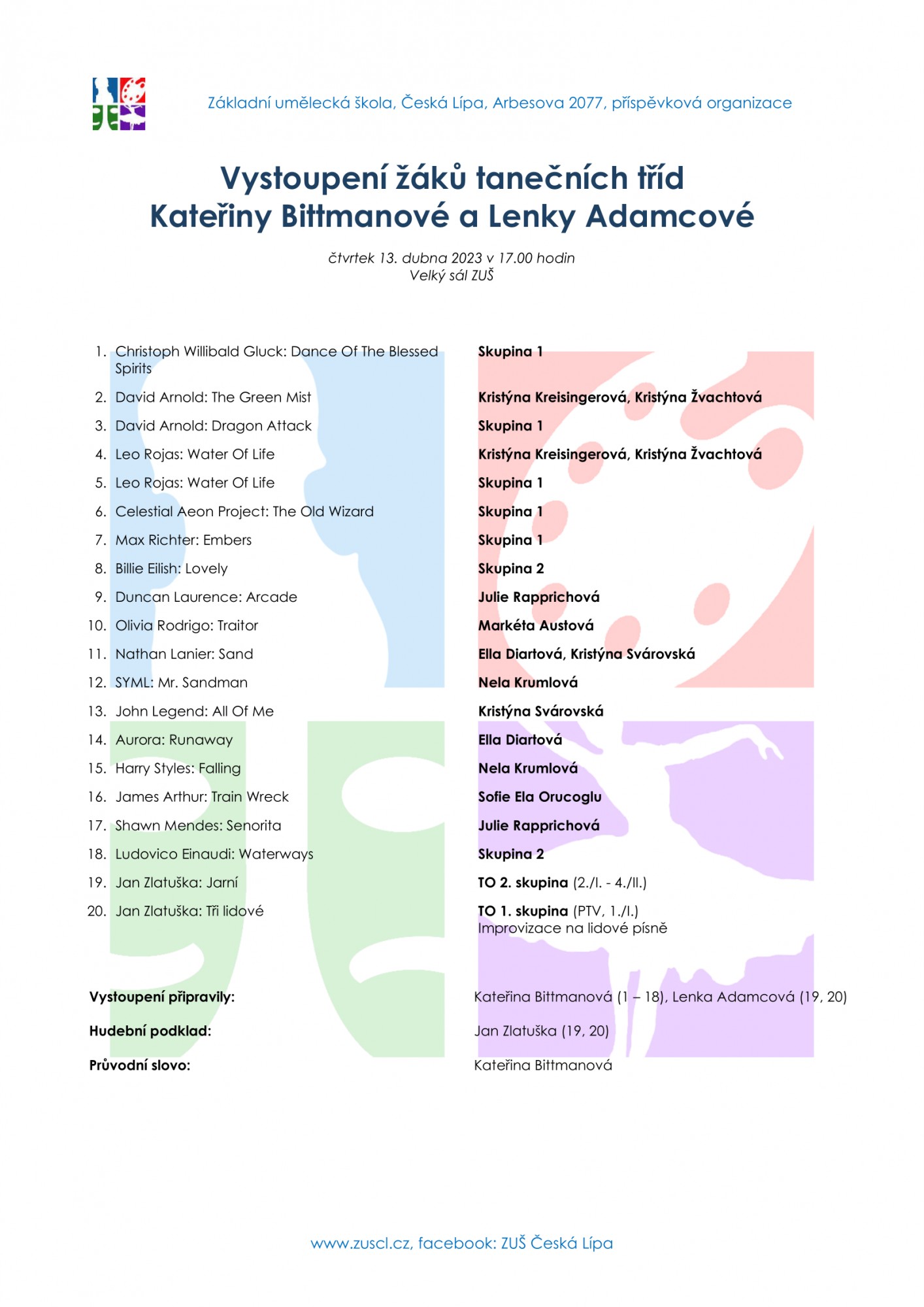 Tanečnice ze tříd p. uč. Kateřiny Bittmanové a Lenky Adamcové předvedou své pohybové umění rodičům a přátelům ve čtvrtek 13. dubna na Velkém sále od 17 hodin.