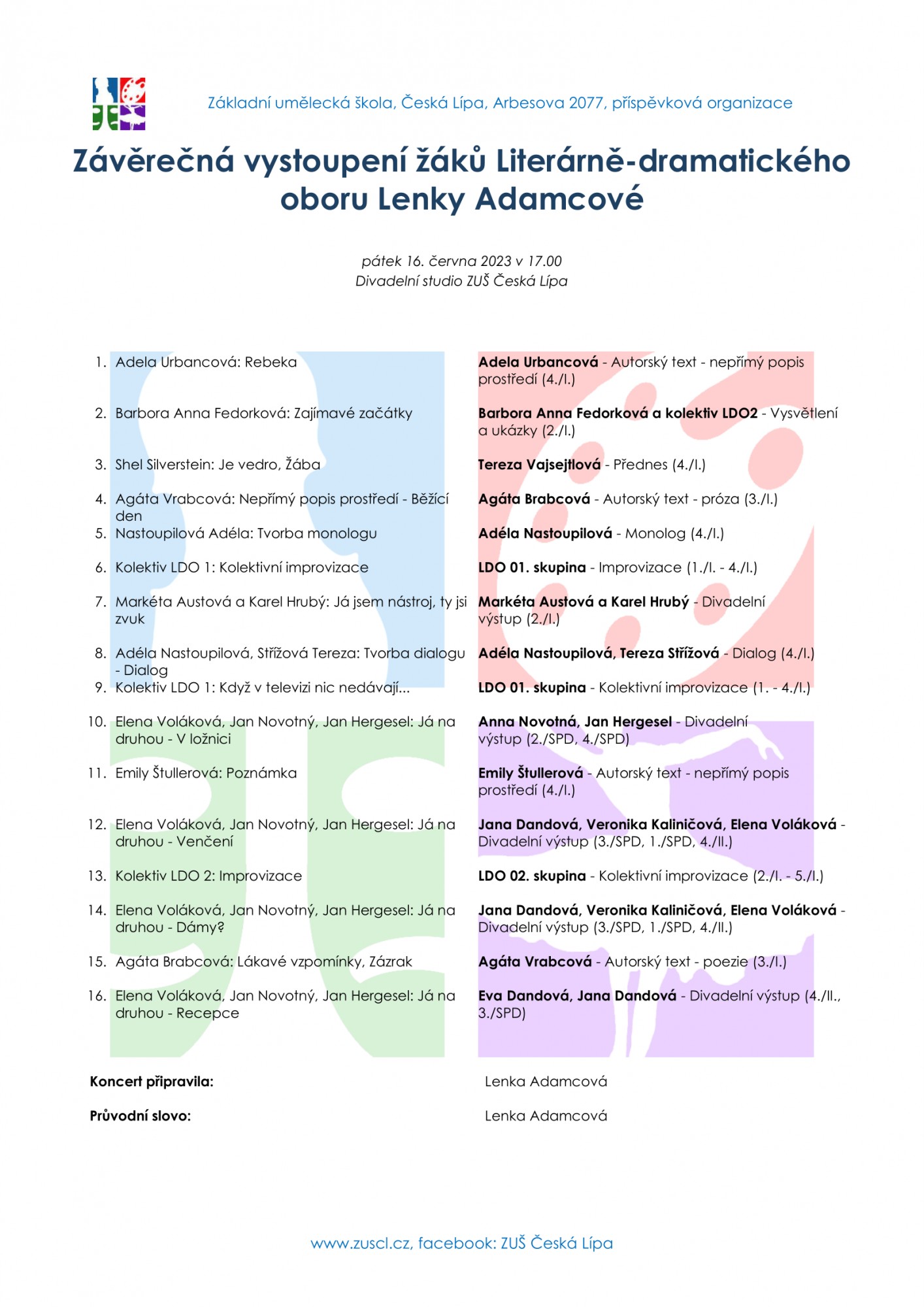 Divadelní studio naposledy v červnu otevře divákům své brány u příležitosti závěrečného vystoupení žáků literárně-dramatického oboru pod vedením p. uč. Lenky Adamcové v pátek 16. června v 17 hodin.