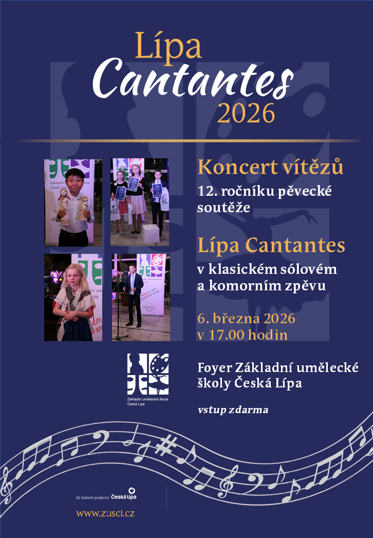 Srdečně zveme všechny fanoušky a příznivce zpěvu, jednoho z nejkrásnějších projevů člověka, do Foyer ZUŠ v pátek 6. března v 17 hodin na koncert, který završí spolu se slavnostním vyhlášením vítězů soutěžní klání pěvecké soutěže Lípa Cantantes 2026.