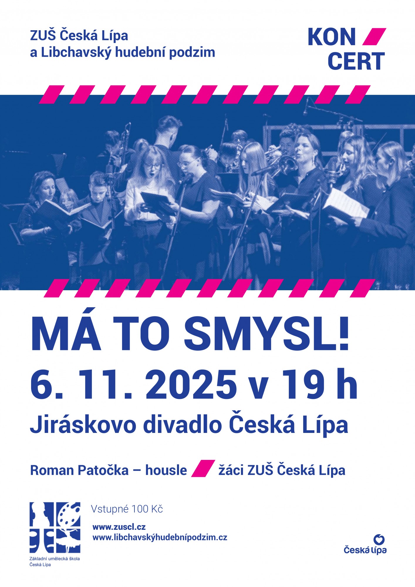 Jiráskovo divadlo Česká lípaKdyž se učíme hudbě, potřebujeme na cestě potkat někoho, kdo v nás probudí vášeň a nadšení. Takovým okamžikem pro naše žáky je setkání s vynikajícím houslistou Romanem Patočkou – nejen na mistrovských kurzech, ale i na jednom pódiu v rámci projektu Má to smysl!, který je součástí Libchavského hudebního podzimu.Těšit se můžete na Romana Patočku, talenty ZUŠ sólově i společně, Jazzovou Farmu i Komorní symfonický orchestr. Celým programem vás provede originální a oblíbený moderátor Jiří Gottlieber. Buďte součástí výjimečného večera Má to smysl! ve čtvrtek 6. listopadu od 19 hodin v Jiráskově divadle. Vstupné je 100 Kč a vstupenky lze zakoupit zde.