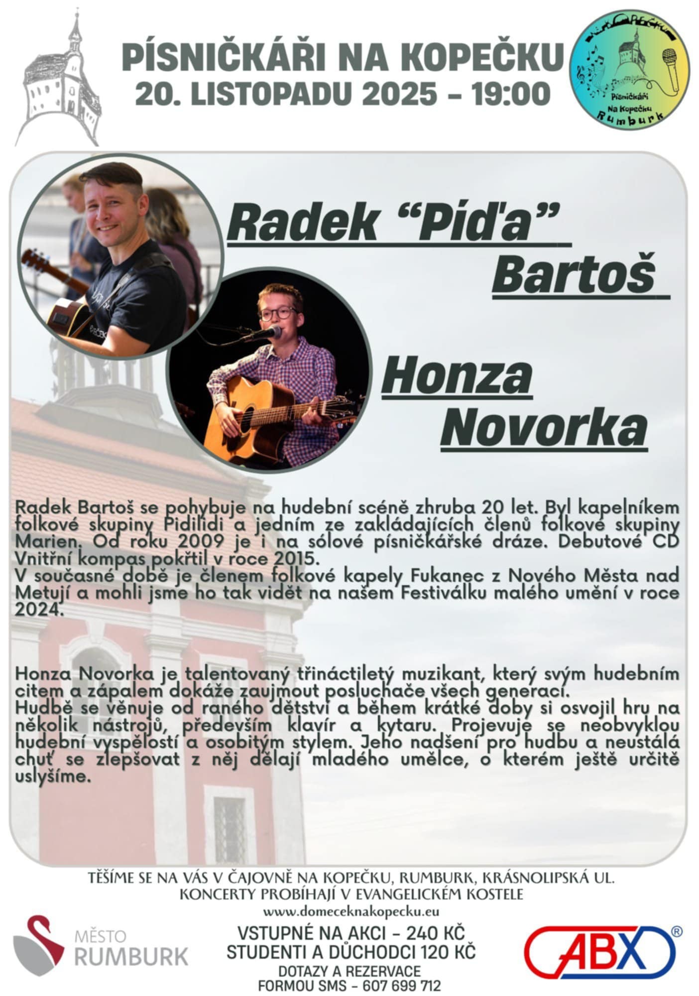 Čajovna Na Kopečku RumburkJan Novorka, talentovaný student zpěvu, hry na kytaru a na klavír vystoupí s členem folkové kapely Fukanec Radkem "Píďou" Bartošem 20. listopadu v čajovně Na Kopečku v Rumburku na akci Písničkáři Na Kopečku od 19 hodin. Více