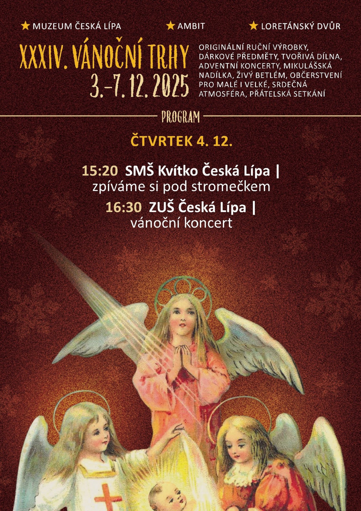Prvním adventním koncertem našich žáků bude "Vánoční koncert v ambitu", který se každoročně koná v rámci vánočních trhů v Biberově síni Vlastivědného muzea v České Lípě. Na tento koncert jste srdečně zváni ve čtvrtek 4. prosince od 16:30 hodin. Přijďte se vánočně naladit.:)
