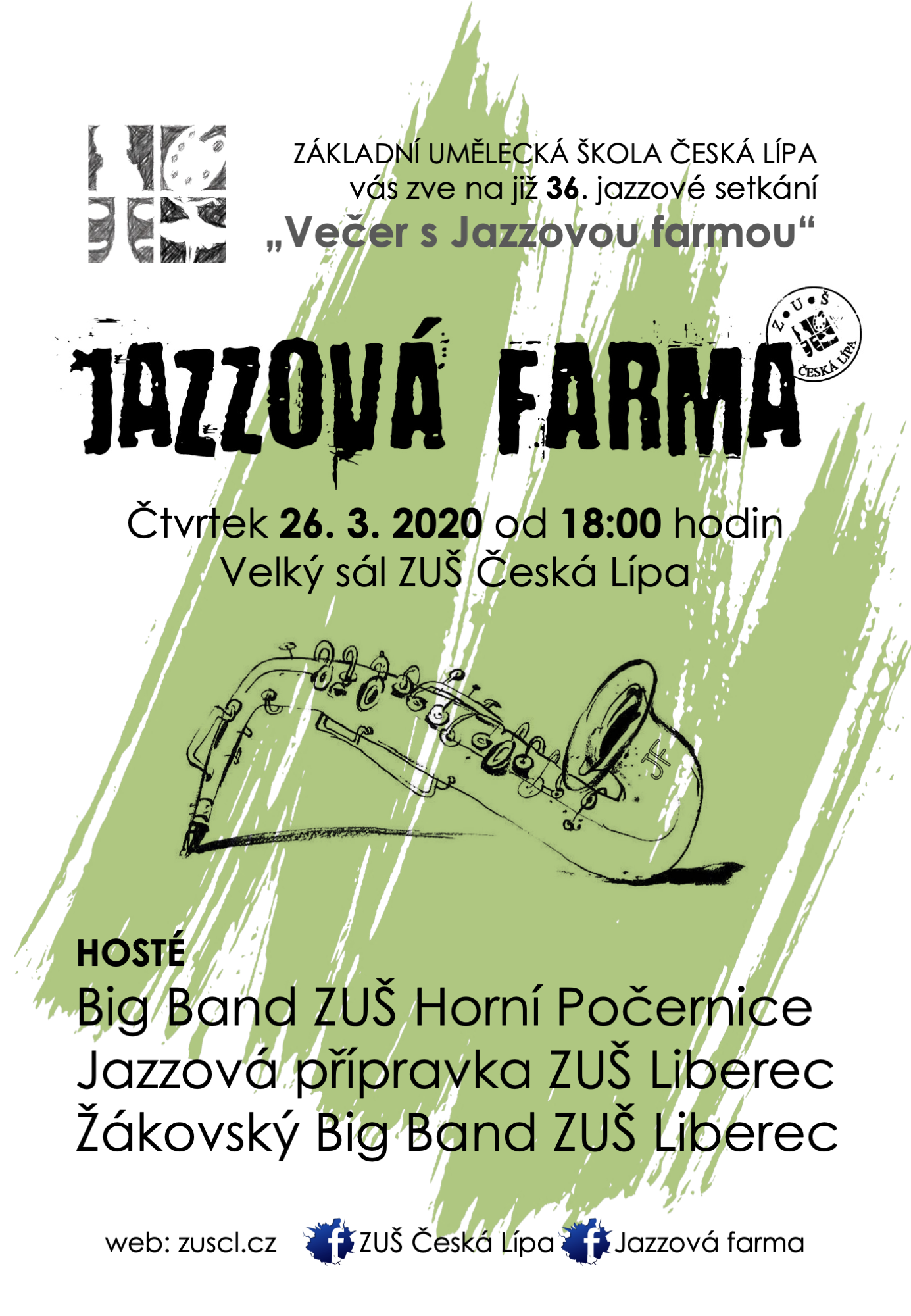 Již 36. tradiční setkání s Jazzovou Farmou na Velkém sále ZUŠ, tentokrát s hosty: Big Band ZUŠ Horní Počernice, Jazzová přípravka ZUŠ Liberec, Žákovský Big Band ZUŠ Liberec. Vstup zdarma.