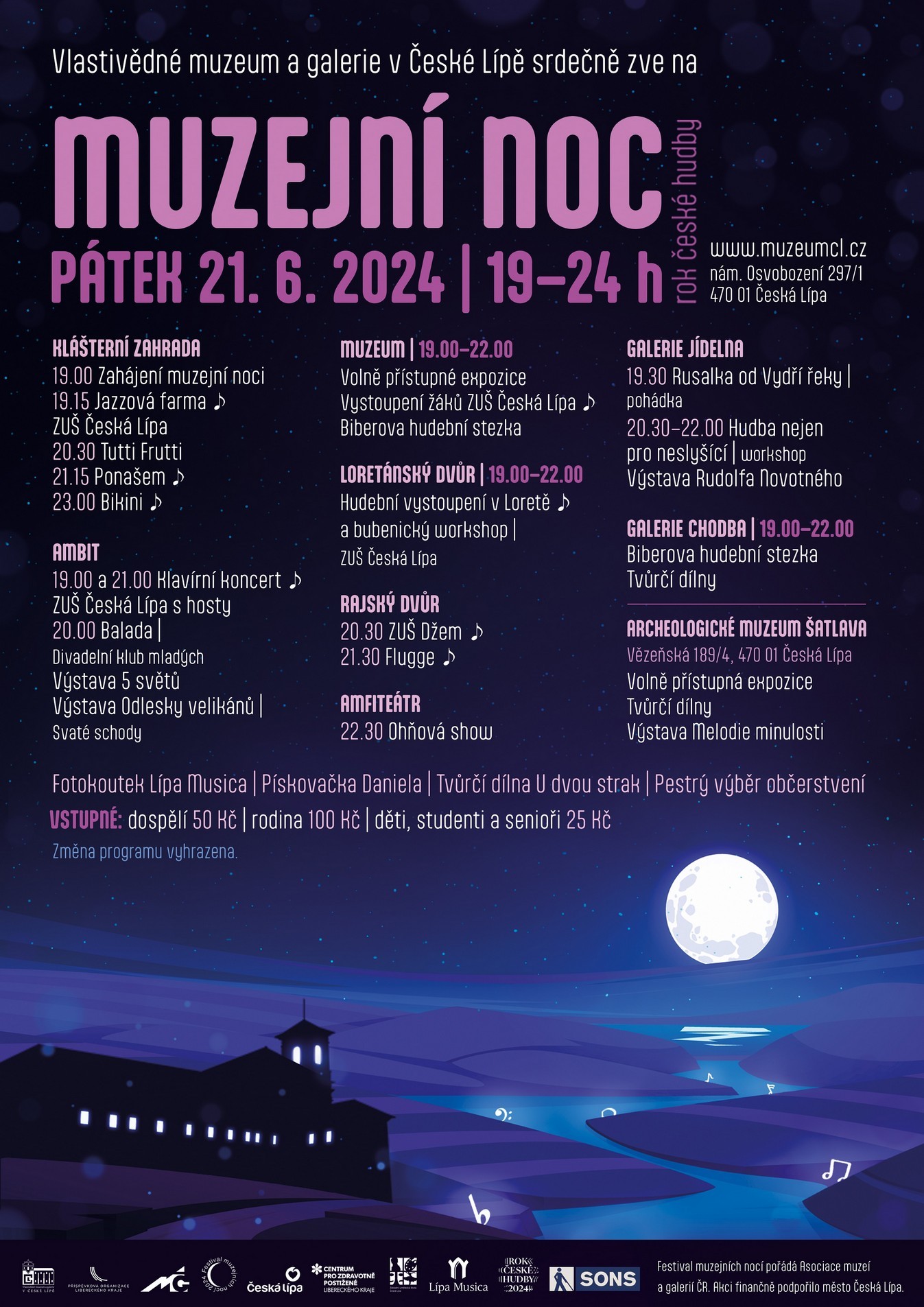 Naši žáci a učitelé předvedou své umění ve výstavních prostorách Vlastivědného muzea a galerie v České Lípě v rámci Muzejní noci v pátek 21. června od 19 do 22 hodin. Uslyšíte hru na klarinety, flétny, v Biberově síni zazní klavír a varhany a u Lorety se můžete těšit na bubenický workshop Vojtěcha Šeminského. Od 19:15 hodin vystoupí v Klášterní zahradě Jazzová Farma pod taktovkou Davida Maška a na Rajském dvoře ZUŠ Džem od 20.30 hodin.Těšíme se na návštěvníky!
