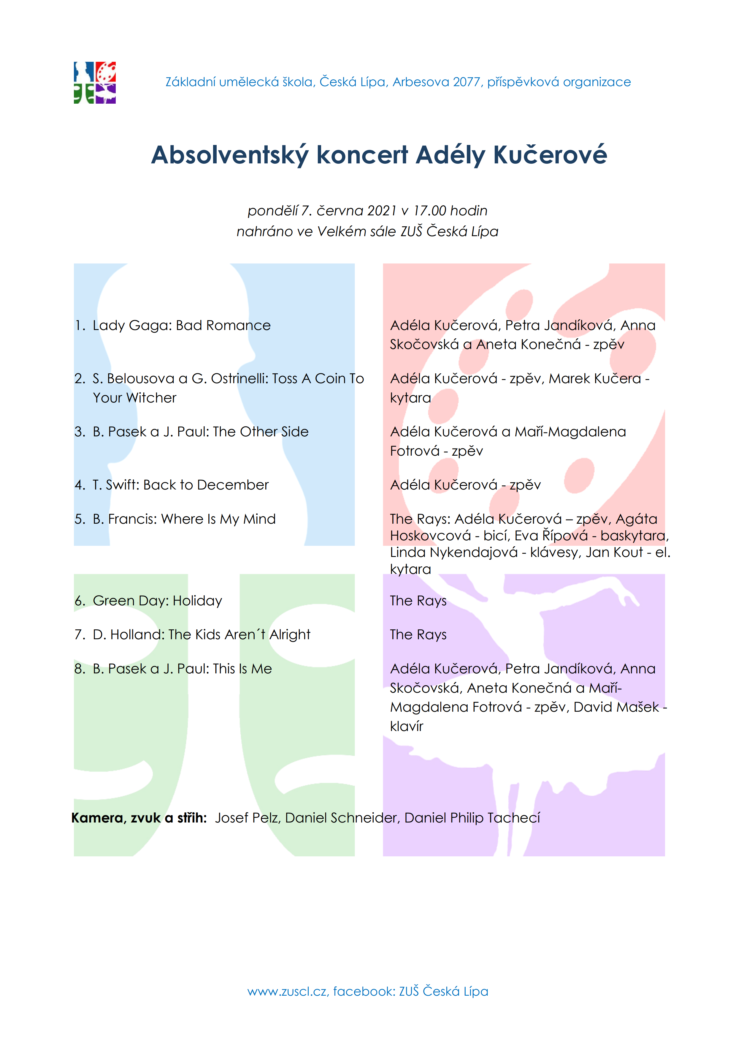 Adéla Kučerová, studentka zpěvu ze třídy Petry Jandíkové, si připravila absolventský koncert, na kterém vám zazpívá sólově, spolu se svými spolužačkami a se svou rockovou kapelou The Rays v pondělí 7. června v 17 hodin. Online koncert můžete shlédnout na YouTube, FB či webu školy.
