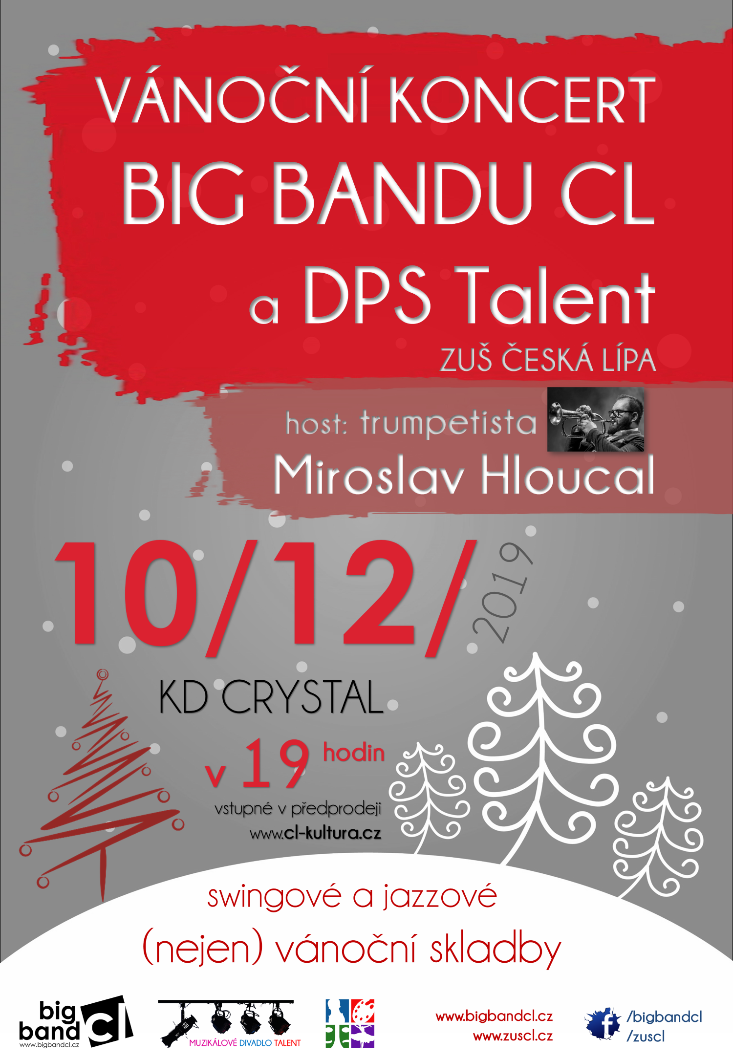 V úterý 10. prosince 2019 jste srdečně zváni Dětským pěveckým sborem Talent a BIG BANDEM CL na jejich společný Vánoční koncert do KD Crystal od 19 hodin, kde vystoupí spolu s trumpetistou, skladatelem a členem Big Bandu Gustava Broma Miroslavem Hloucalem. Vstupenky v hodnotě 150,- Kč jsou již v předprodeji - www.cl-kultura.cz.