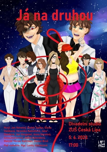 Nové představení literárně-dramatického oboru pod vedením Lenky Adamcové "Já na druhou" z autorského pera Eleny Volákové, Jana Novotného a Jana Hergesela bude uvedeno v Divadelním studiu ZUŠ v pondělí 5. června v 9 a 10:30 hodin pro SŠ.