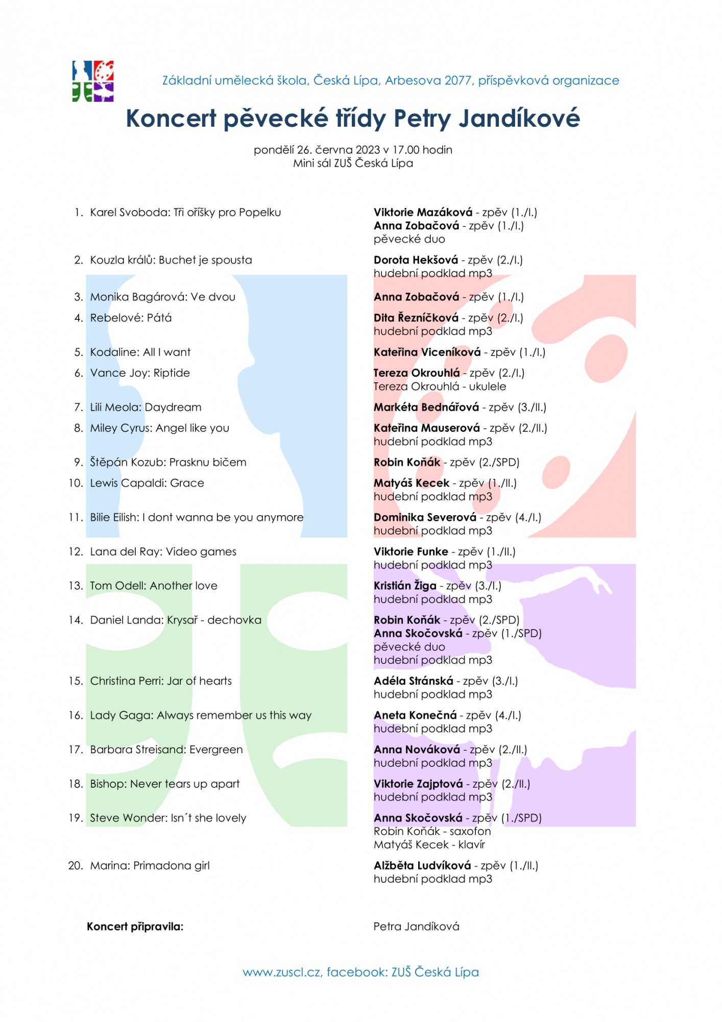 Všechny zpěvačky a zpěváky ze třídy p. uč. Petry Jandíkové si můžete osobně poslechnout na pěveckém koncertu v pondělí 26. června od 17 hodin v Minisále ZUŠ.