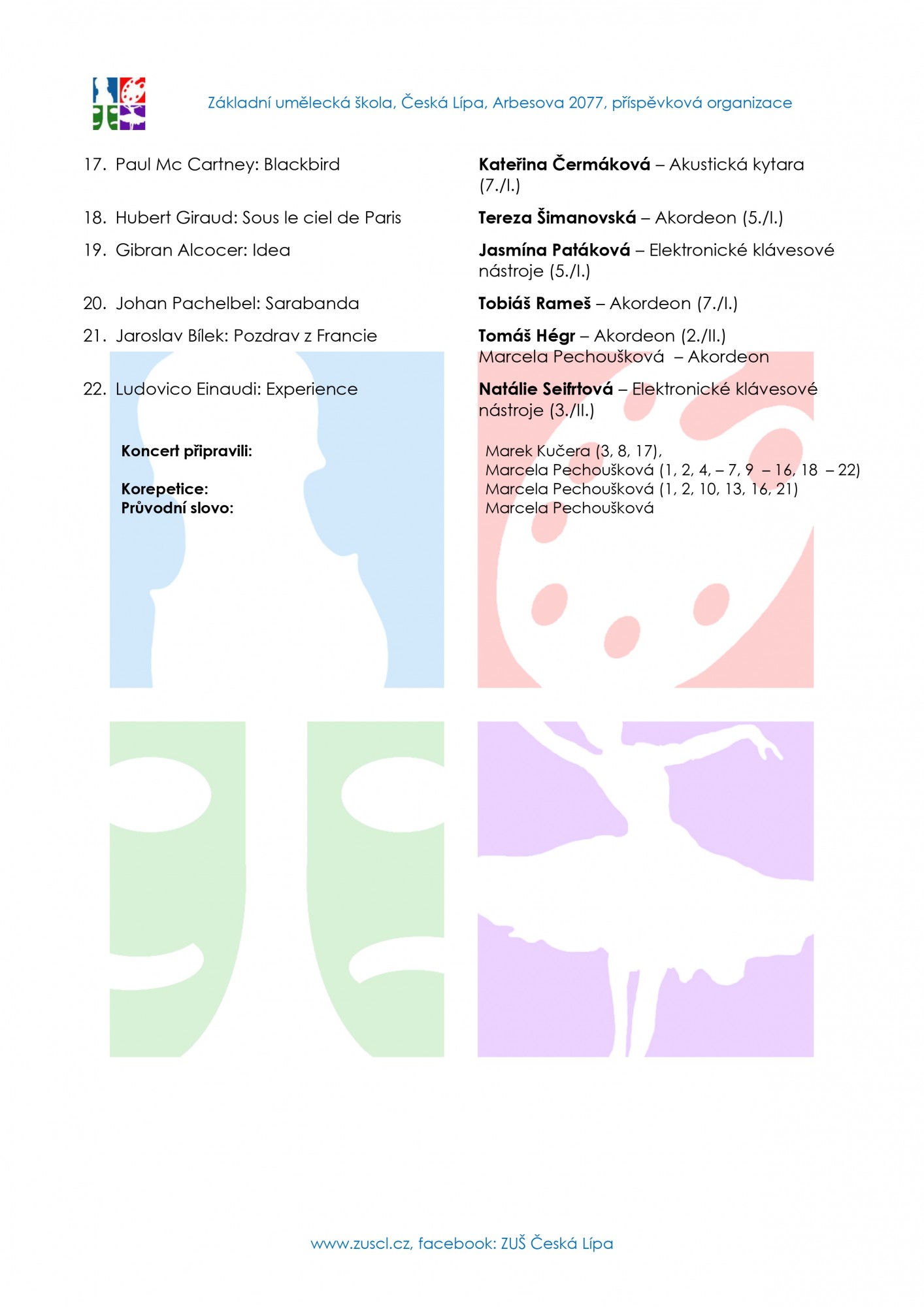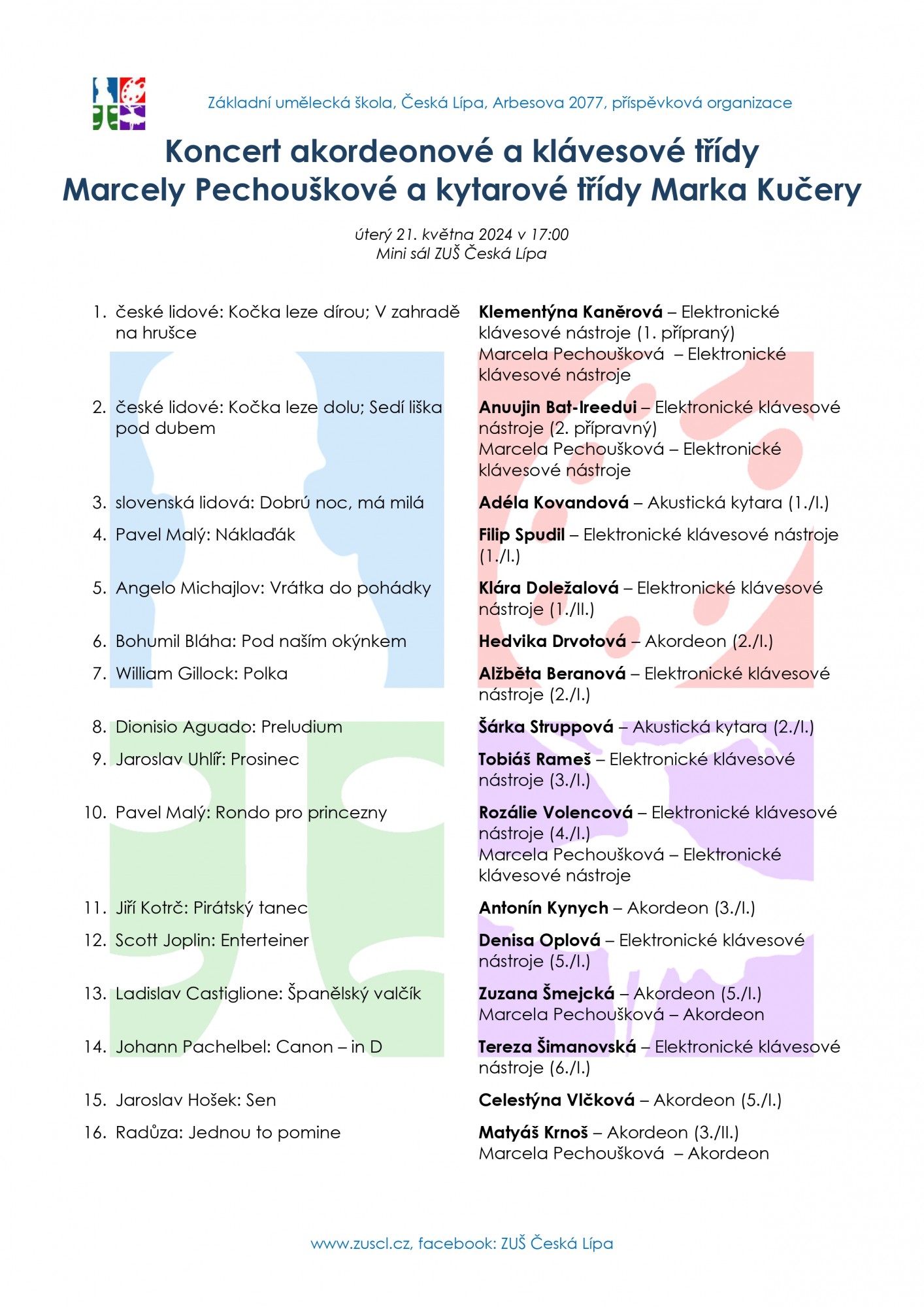 Tradiční společné koncertování žáků a studentů dvou tříd - Marcely Pechouškové a Marka Kučery, přinese svým divákům tóny akordeonů, kytar a elektrických kláves v úterý 21. května v 17 hodin v Minisále ZUŠ.