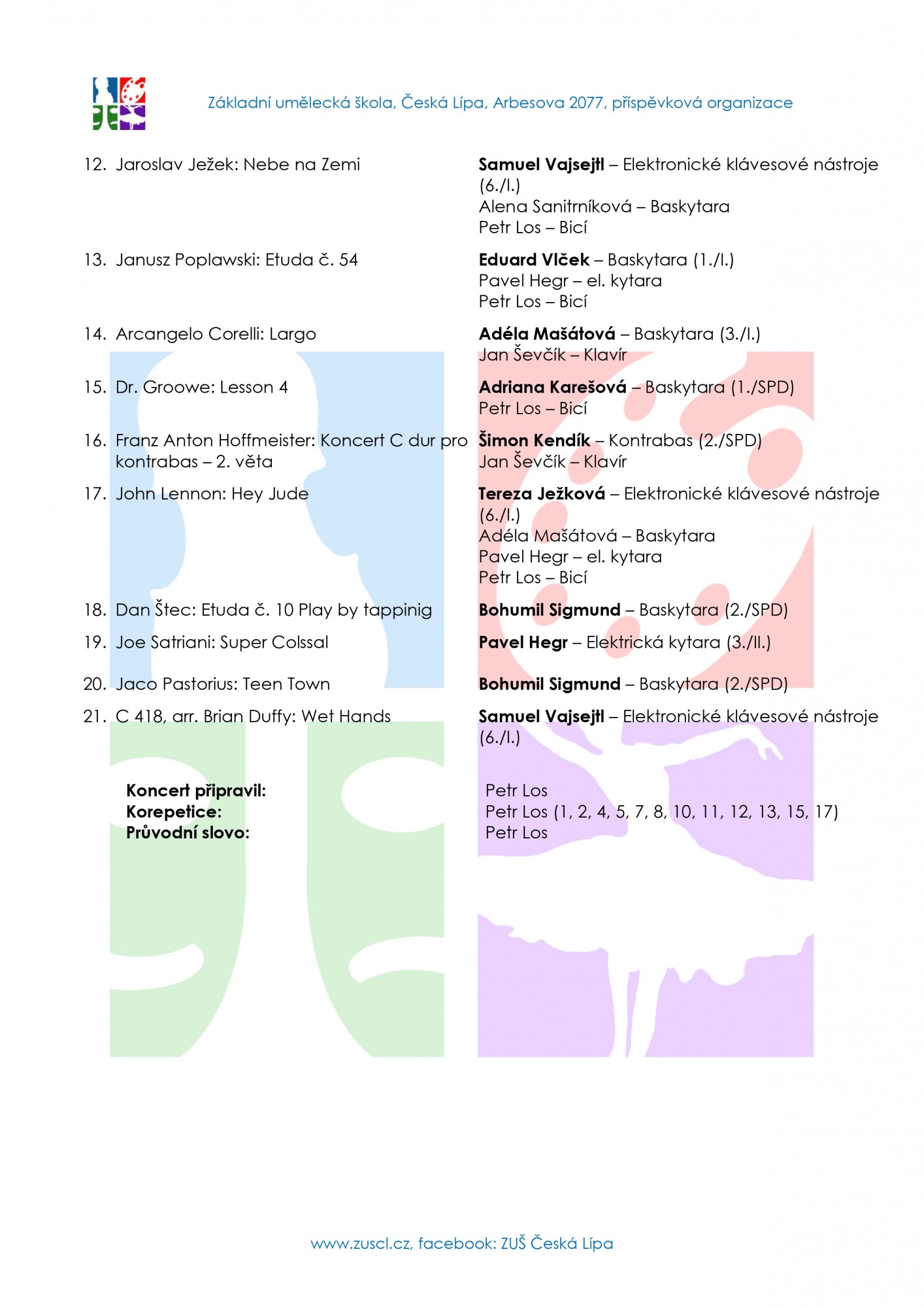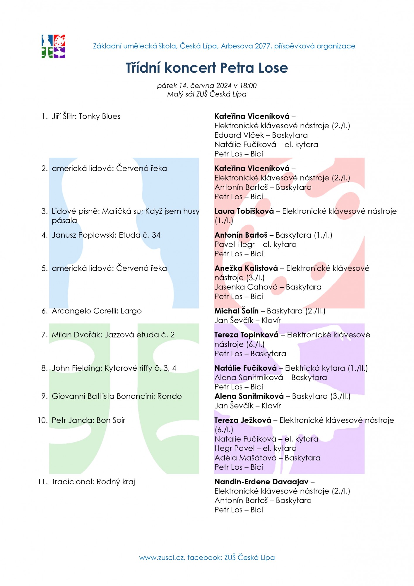 Hra na elektrické klávesy, el. kytaru, baskytaru i kontrabas zazní na koncertu třídy p. uč. Petra Lose v pátek 14. června v Malém sále ZUŠ od 18 hodin.