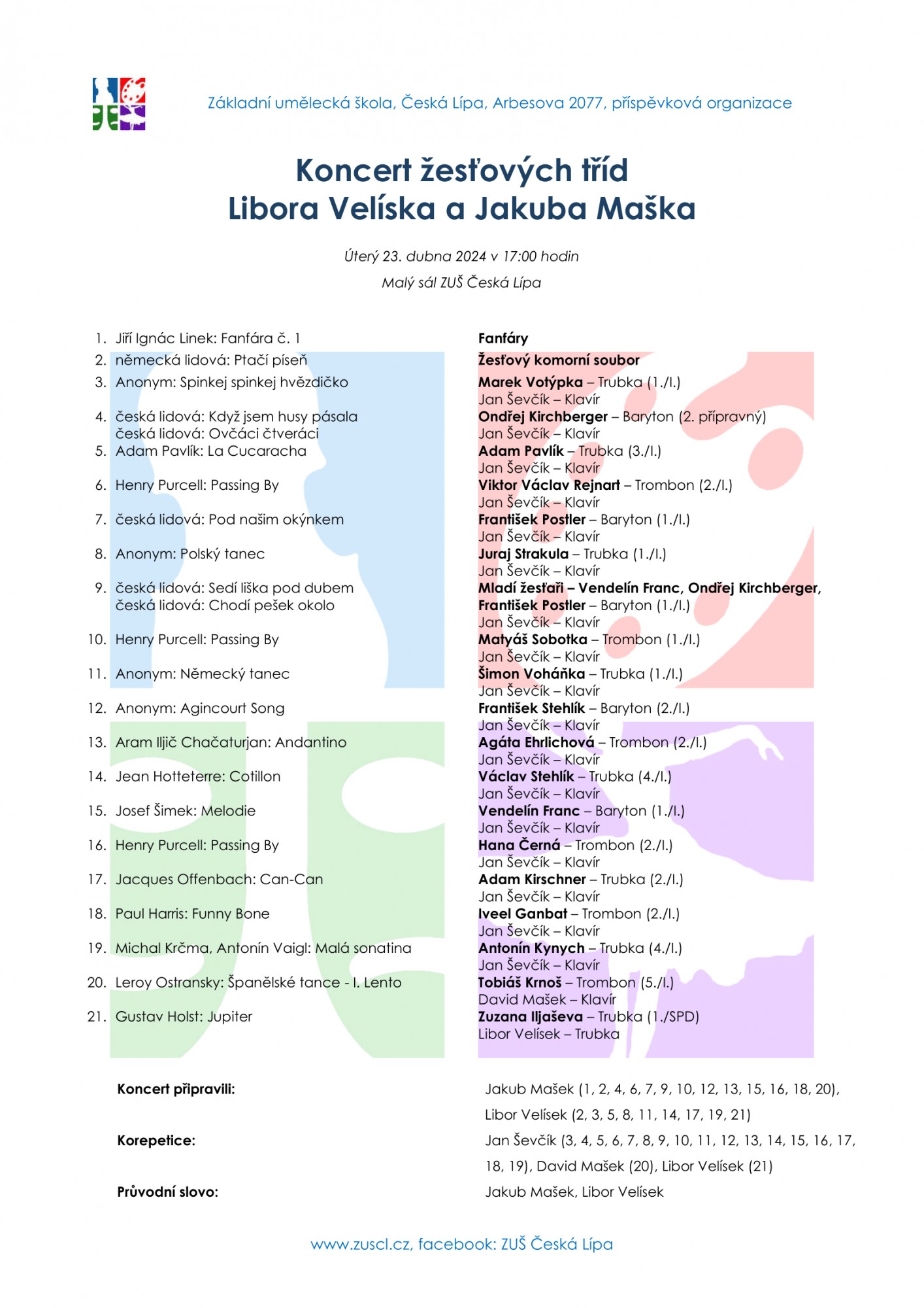 Pravidelné žesťové koncerty doplní koncert dvou žesťových tříd, a to pánů učitelů Jakuba Maška a Libora Velíska. Na žesťaře se můžete těšit v úterý 23. dubna od 17 hodin v Malém sále ZUŠ.