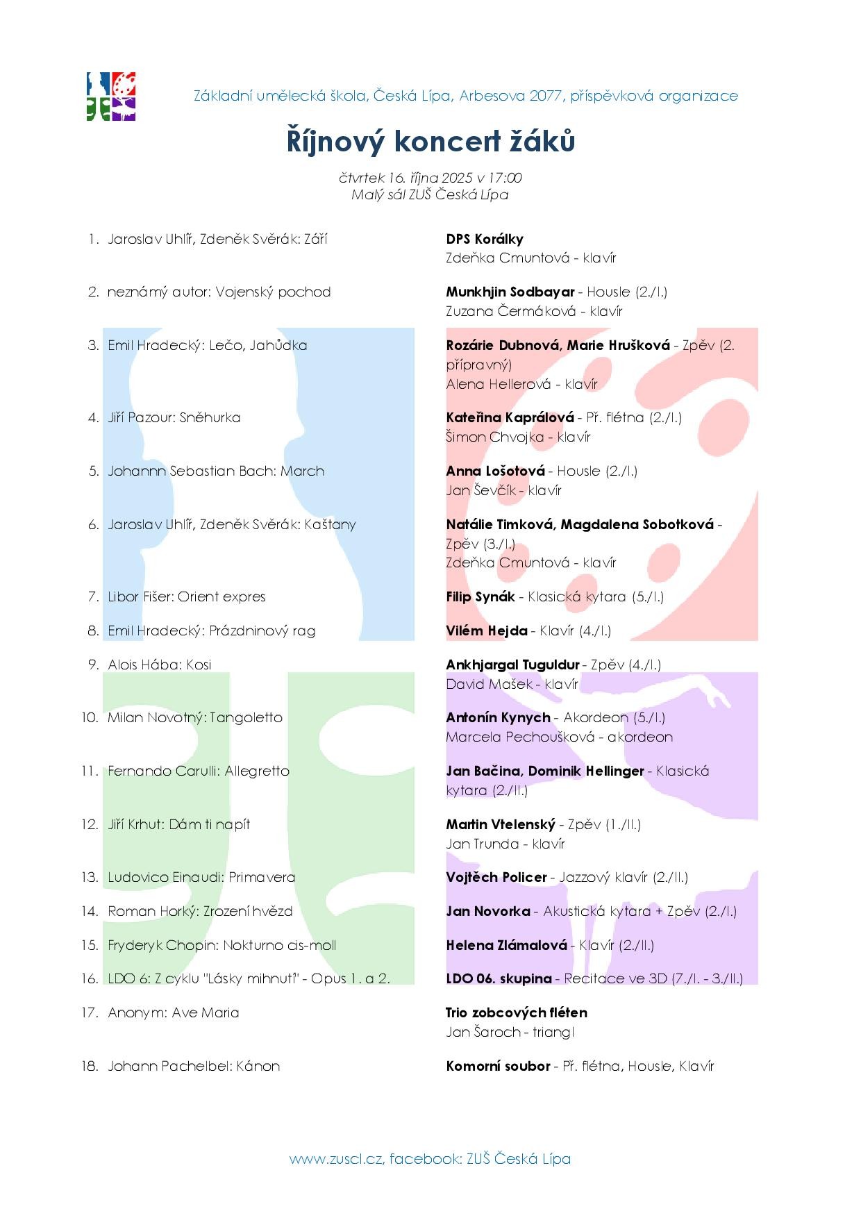 Říjnový koncert žáků ZUŠ zahájí pravidelnou měsíční přehlídku, kde mladí talenti z různých oborů předvedou své dovednosti a umělecké nadání. První společný koncert proběhne v Malém sále ve čtvrtek 16. října od 17:00. Přijďte se inspirovat, podpořit mladé umělce a užít si pestrý program – jste všichni srdečně zváni!