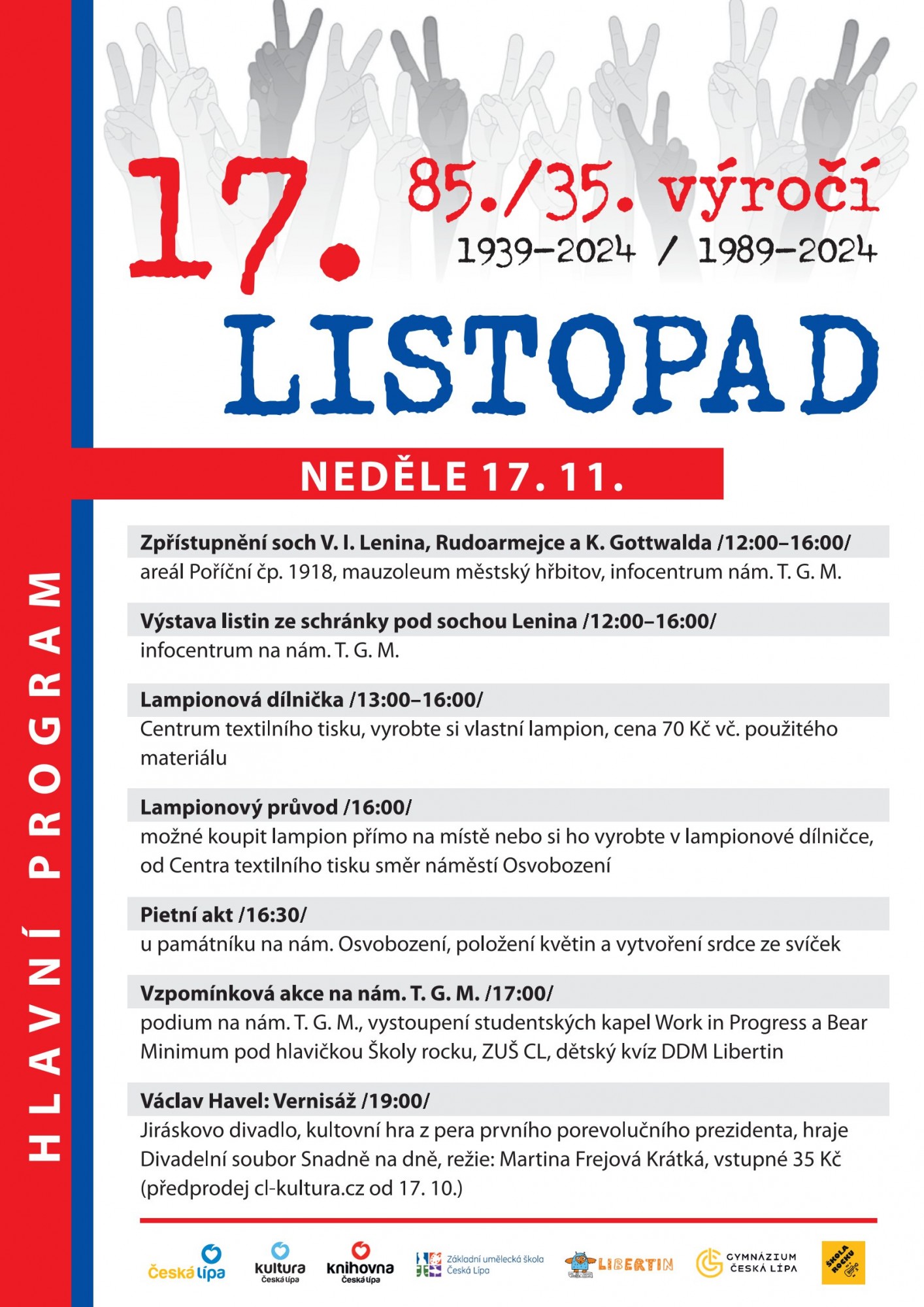 Česká státní hymna a píseň Modlitba pro Martu nepochybně patří k oslavám 35. výročí sametové revoluce. Obojí zazní v podání žáků a učitelů ZUŠ na pietním aktu v 16:30 hodin u památníků na nám Osvobození, kde se můžete podílet na vytvoření srdce ze svíček. V 17 hodin ZUŠ zahájí vzpomínkovou akci na náměstí T. G. Masaryka, kde se můžete těšit na vystoupení studentských kapel pod hlavičkou Školy rocku. Pojďme společně oslavit 35. výročí 17. listopadu!