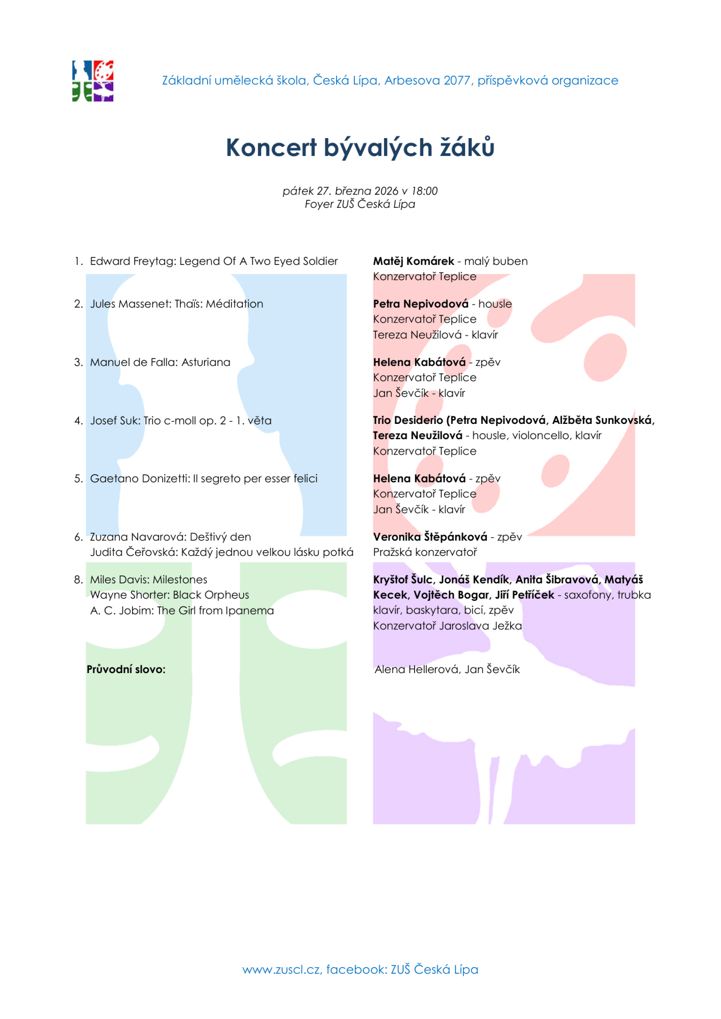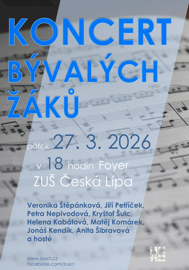 Nenechte si ujít tradiční "Koncert bývalých žáků" naší ZUŠ, který se uskuteční ve Foyer v pátek 27. března v 18 hodin. Koncert připravují p. uč. Alena Hellerová a Jan Ševčík a vystoupí na něm naši úspěšní bývalí žáci, např. Petra Nepivodová na housle a její hosté Tereza Neužilová (klavír) a Alžběta Sunkovská (violoncello). Těšit se může na bicí Matěje Komárka a Jiřího Petříčka, zpěv Heleny Kabátové a Veroniky Štěpánkové, saxofony Kryštofa Šulce a Anity Šibravové a trubku Jonáše Kendíka - více. Koncert přinese nejen příjemné setkání těchto bývalých studentů a jejich učitelů, ale i nezapomenutelný hudební zážitek jejich přátelům a fanouškům. Vstup zdarma.