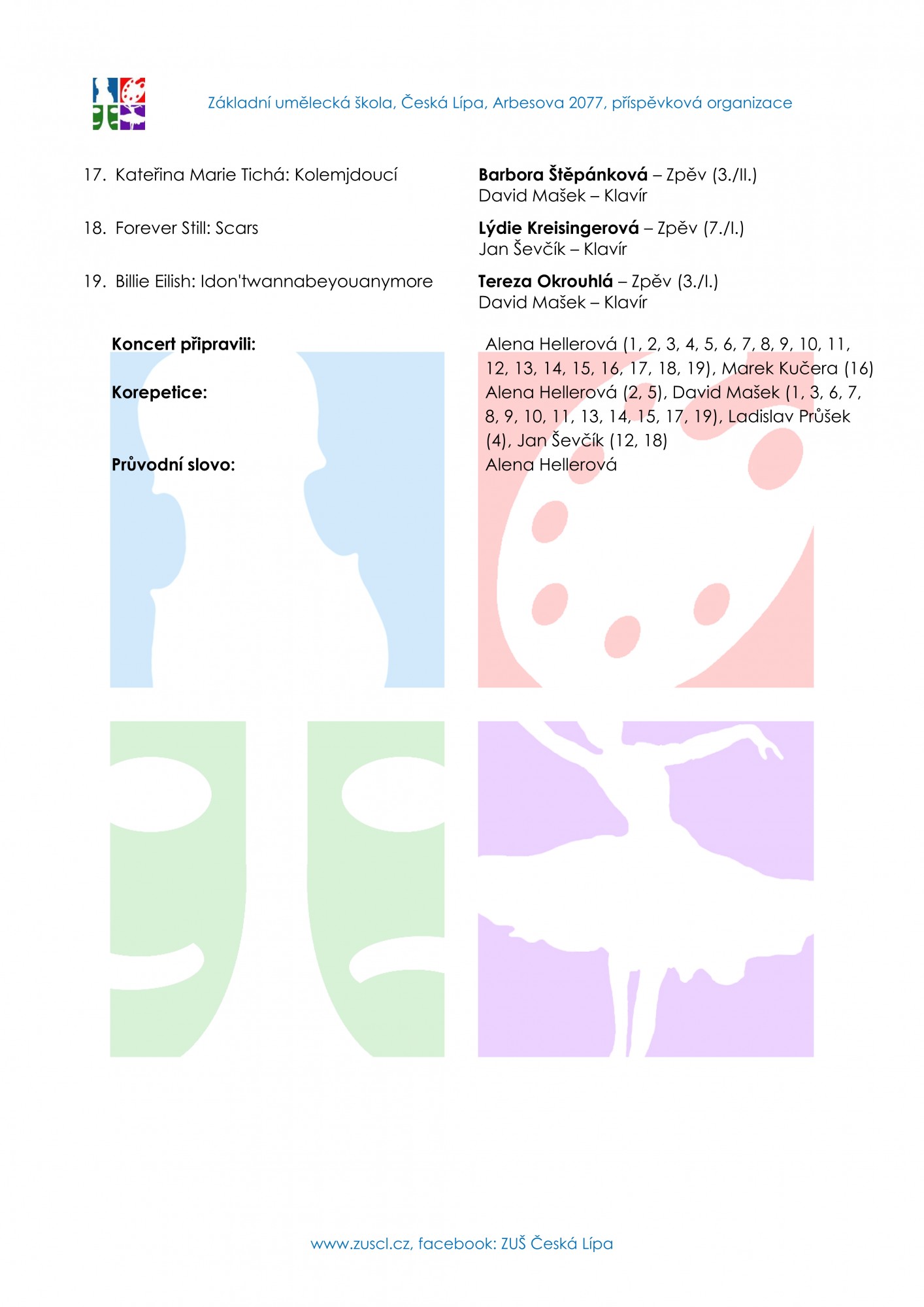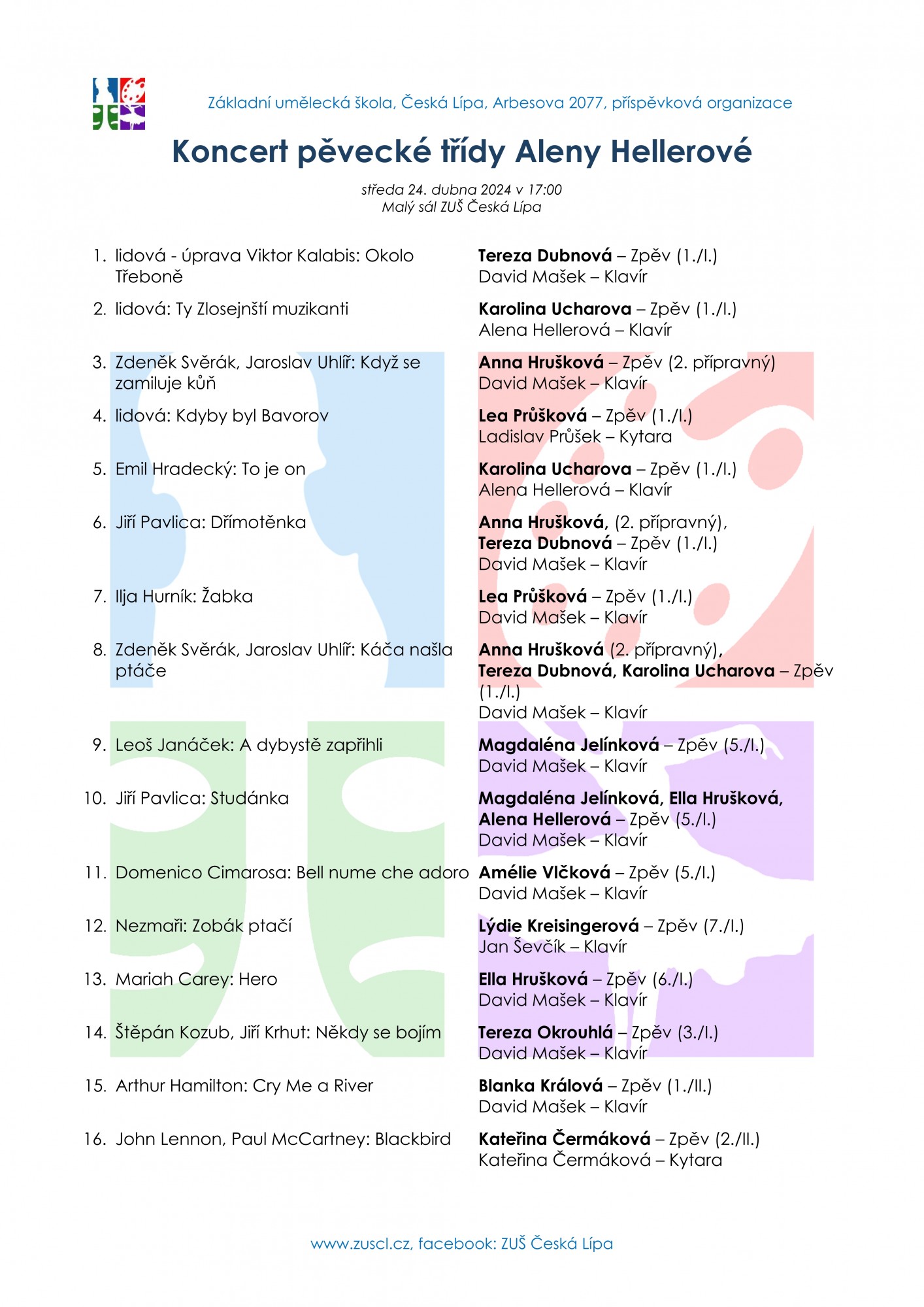 Talentovaní pěvci a pěvkyně ze třídy p. učitelky Aleny Hellerové vám předvedou své zpěvné hlasy na třídním koncertu ve středu 24. dubna od 17 hodin v Malém sále ZUŠ.