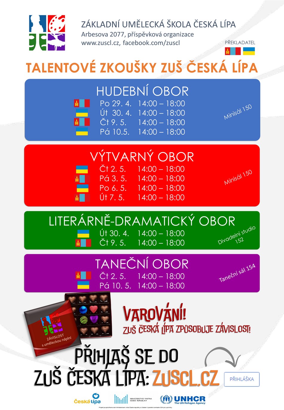 Rozvrstvení talentových zkoušek pro jednotlivé studijní obory si můžete prohlédnout v přiloženém souboru. Z nabídky termínů si můžete vybrat ten, který vám nejvíce vyhovuje. Na talentových zkouškách bude ve dnech označených příslušnou vlajkou přítomna překladatelka do mongolského a ukrajinského jazyka.