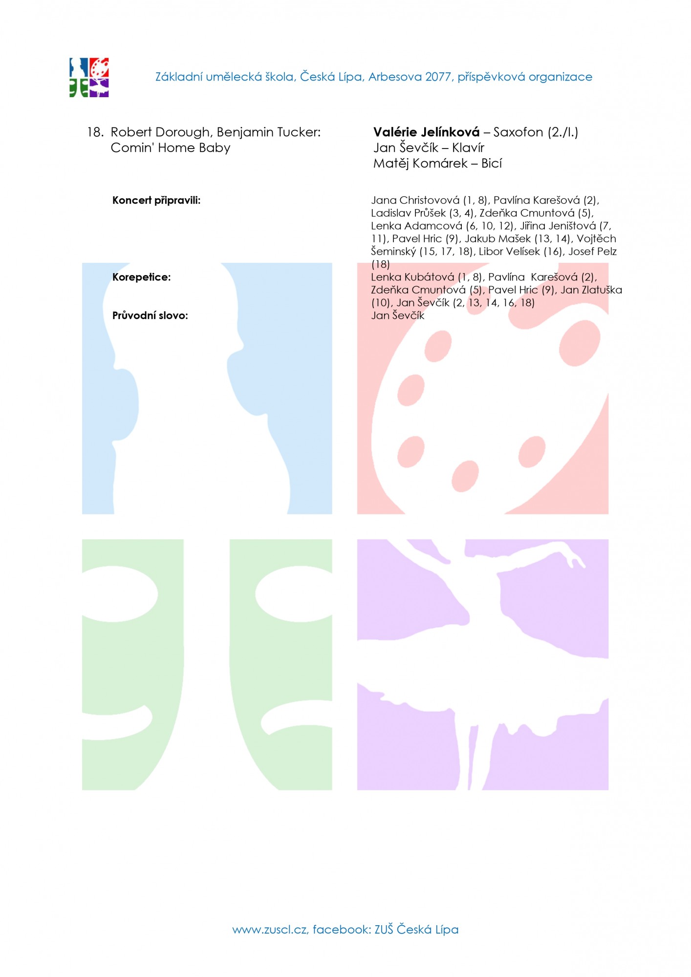 Výchovný koncert pro nejstarší třídy MŠ a 1. stupeň ZŠ vám nabídne ukázky hry na různé nástroje či zpěvu a tance v prostředí ZUŠ prostřednictvím našich učitelů i studentů. První koncert pro děti je od 9 hodin, druhý začíná v 10:30 hodin. Objednávky prosíme na tel. 728 988 057 nebo na marketa.nesporova @zuscl.cz.